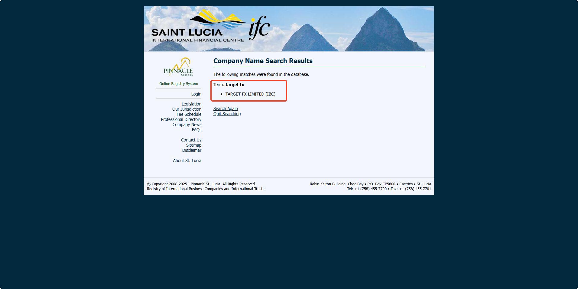 Target FX does not claim to be licensed by any regulator; it only claims to be registered in Saint Lucia. While we can confirm that there is a company with the same name in the Saint Lucia International Financial Centre (IFC) registry, this registration only grants it International Business Company (IBC) status. This does not constitute a valid financial licence. The IFC neither regulates nor licences forex trading activities.