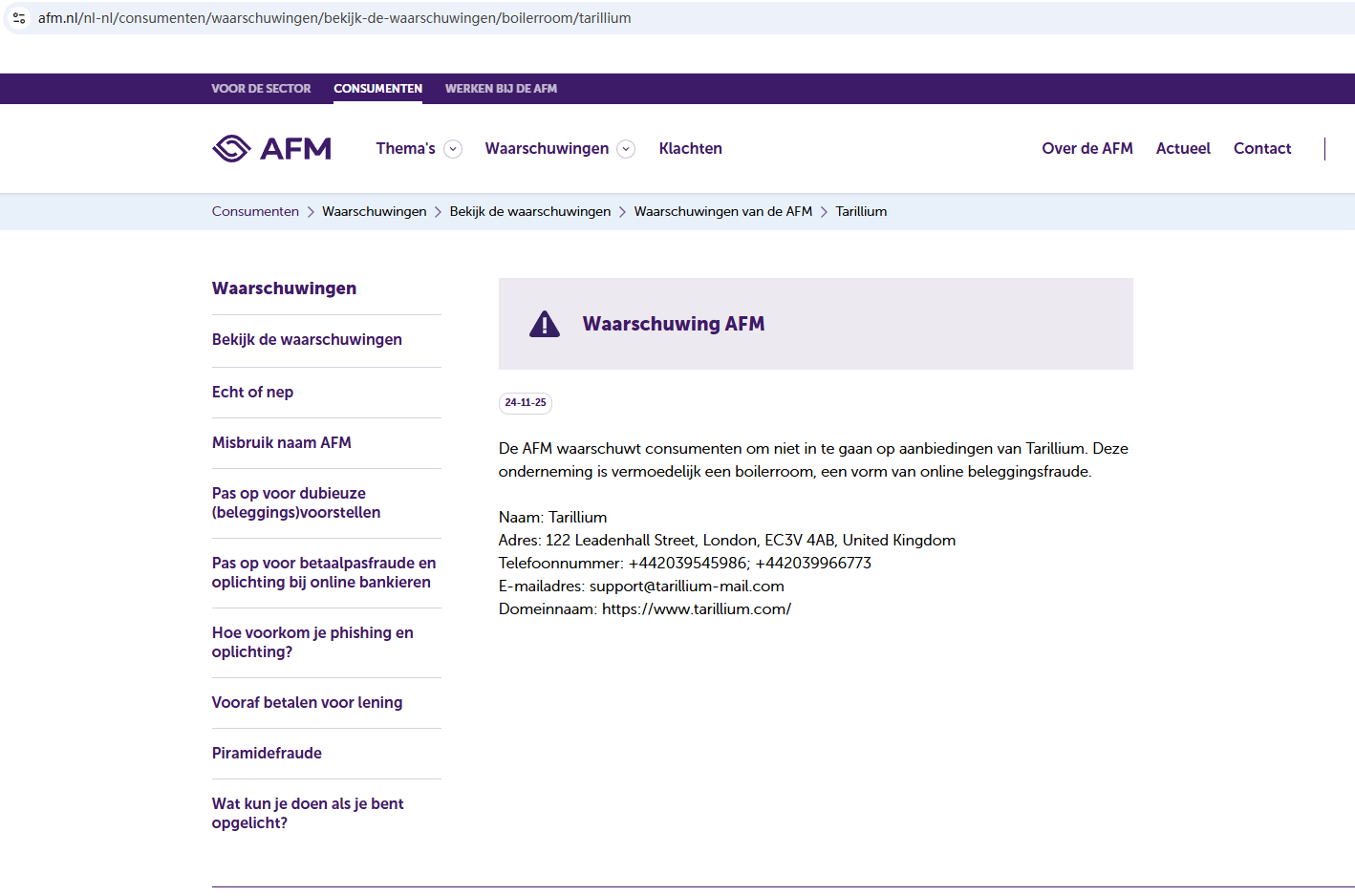 On Nov 24, 2025, the Autoriteit Financiële Markten (AFM) issued a warning regarding Tarillium, suspecting that this company may be offering financial services or products without the necessary authorization. https://www.afm.nl/nl-nl/consumenten/waarschuwingen/bekijk-de-waarschuwingen/boilerroom/tarillium