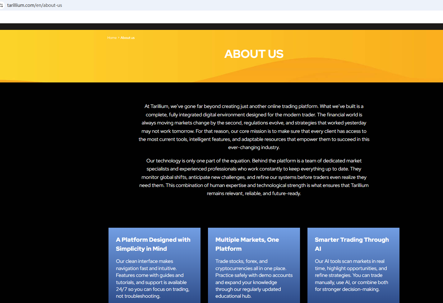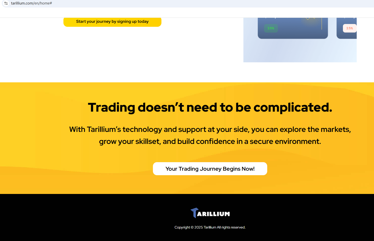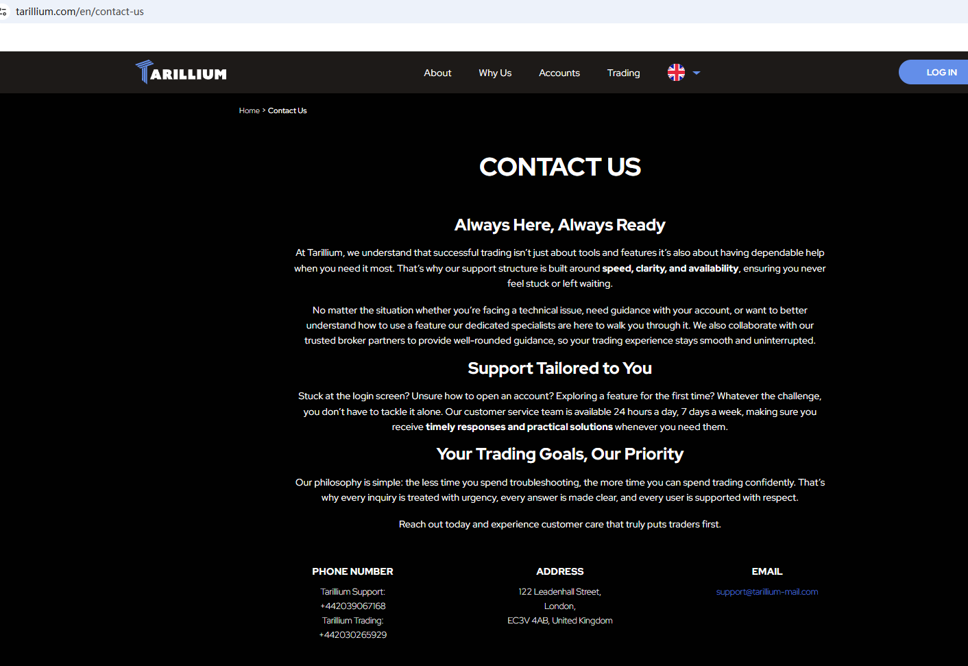 According to its website, it is located in the UK. Upon investigation, no matching information was found in the Financial Conduct Authority (FCA). In addition, the Autoriteit Financiële Markten (AFM) issued a warning regarding Tarillium, suspecting that this company may be offering financial services or products without the necessary authorization.