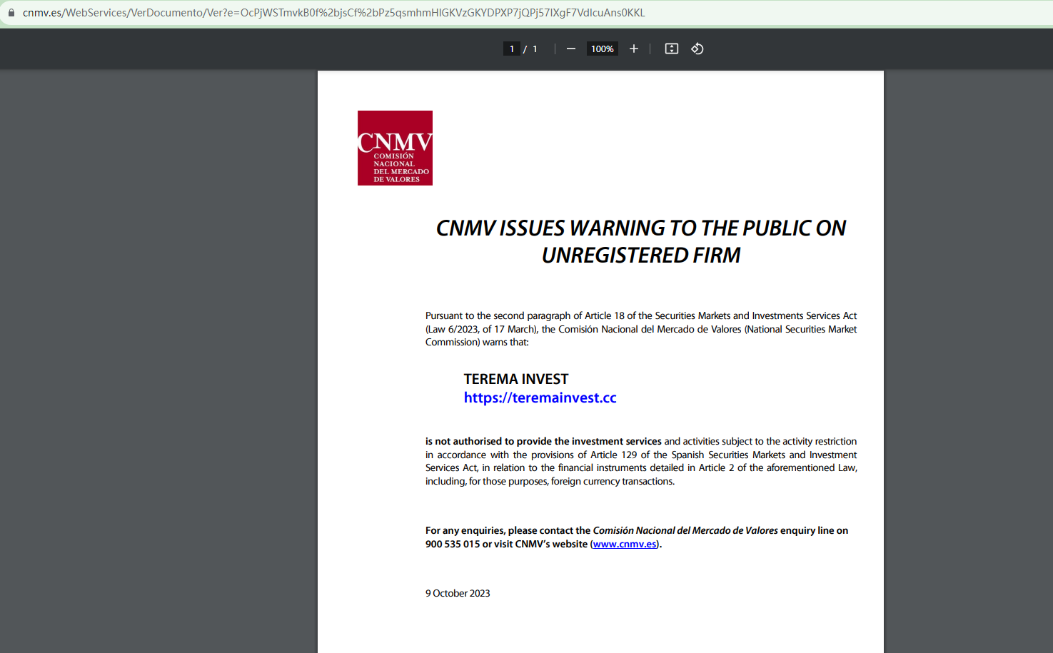 Furthermore, the Comisión Nacional del Mercado de Valores (CNMV) added Terema Invest to its warning list for providing investment services without authorization.