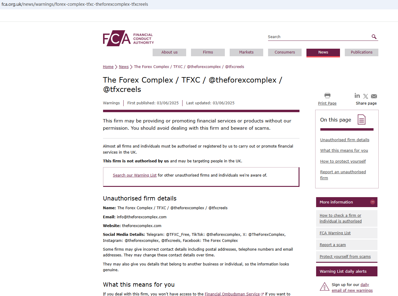 On Jun 3, 2025, the Financial Conduct Authority (FCA) issued a warning against The Forex Complex, believing this company might be providing financial services or products without proper authorization in the UK. https://www.fca.org.uk/news/warnings/forex-complex-tfxc-theforexcomplex-tfxcreels