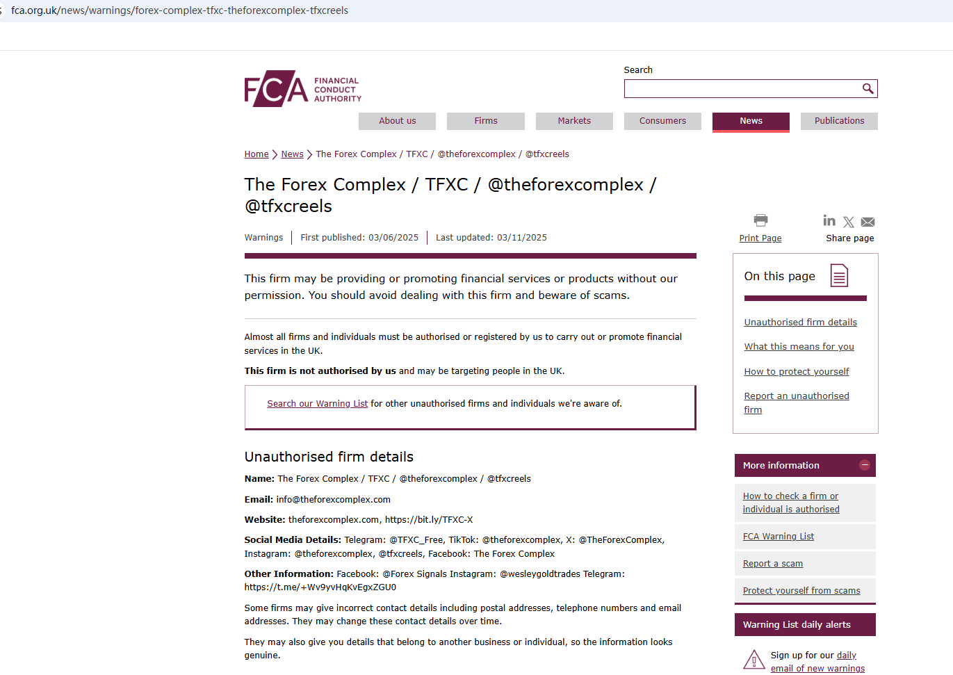 On Nov 3, 2025, the Financial Conduct Authority (FCA) issued a warning regarding The Forex Complex, suspecting that this company may be offering financial services or products without the necessary authorization. https://www.fca.org.uk/news/warnings/forex-complex-tfxc-theforexcomplex-tfxcreels