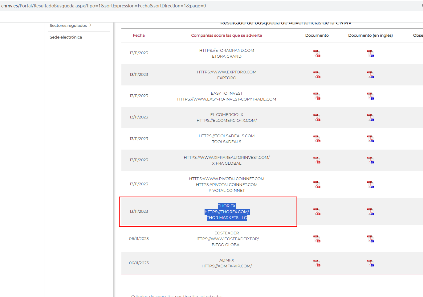 In addition, the Comisión Nacional del Mercado de Valores (CNMV) issued a warning that THOR FX was providing financial services or products without authorisation.