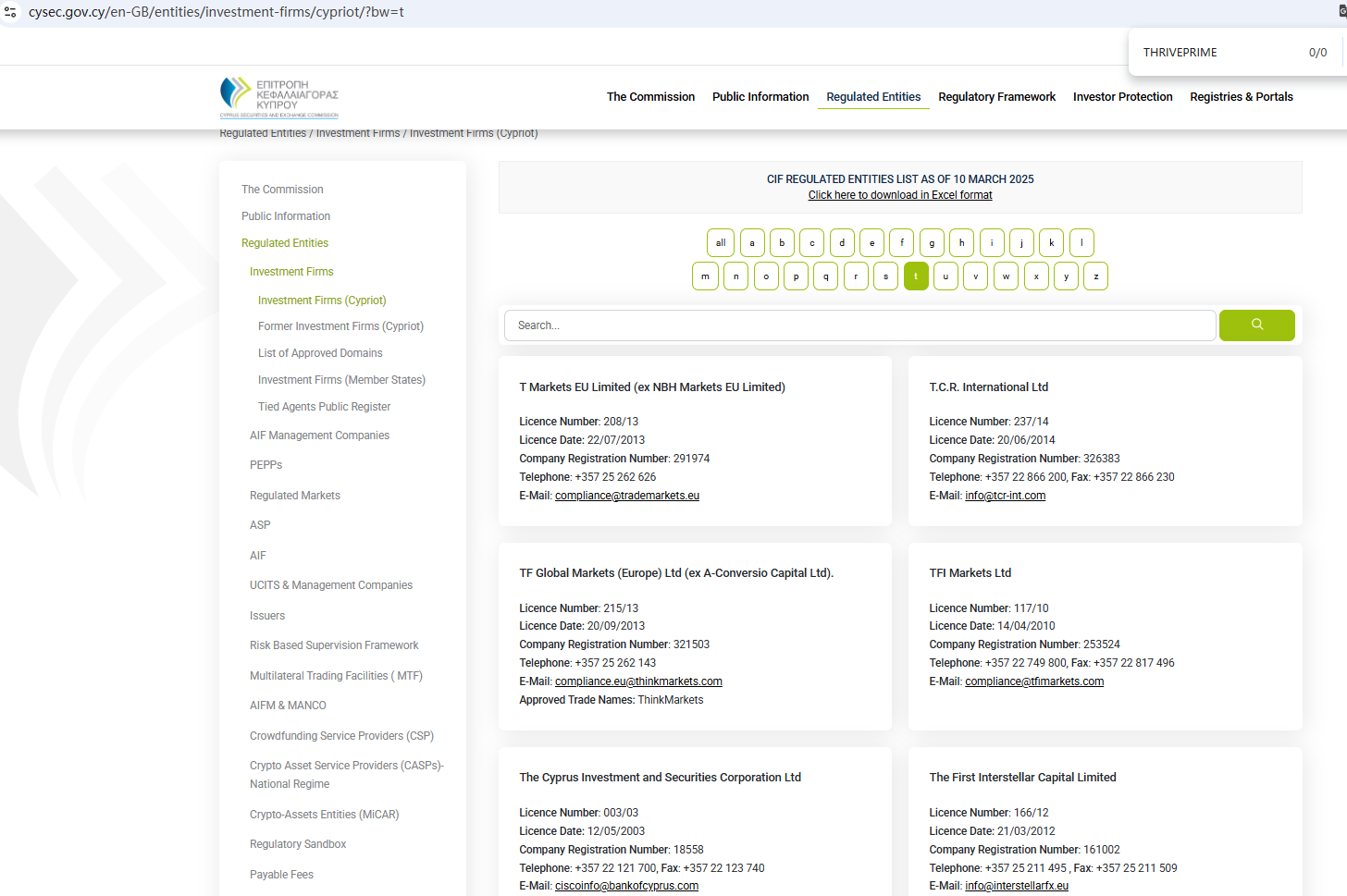 According to its website, it is regulated by both the Financial Conduct Authority (FCA) and the Cyprus Securities and Exchange Commission (CySEC). However, a search revealed no matching information with CySEC. Furthermore, the FCA issued a warning regarding THRIVEPRIME-FORUM INVESTMENTS, suspecting that this company may be offering financial services or products without the necessary authorization.