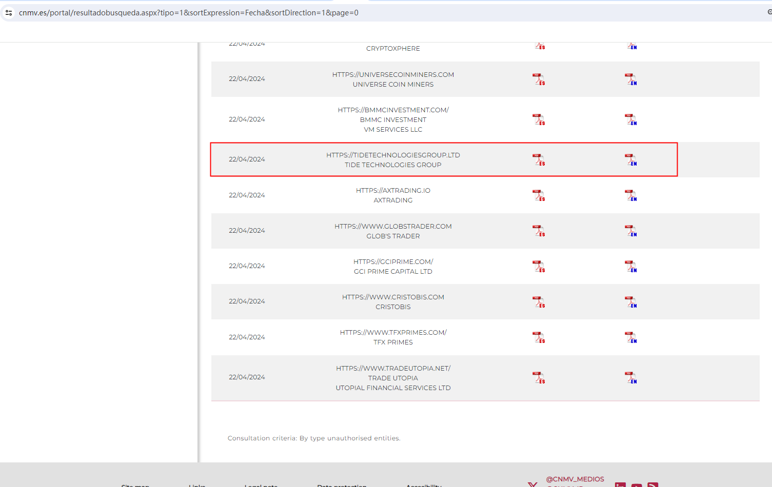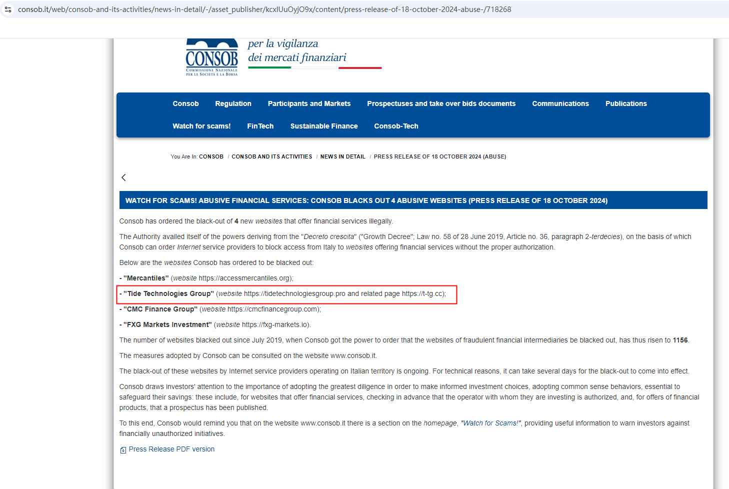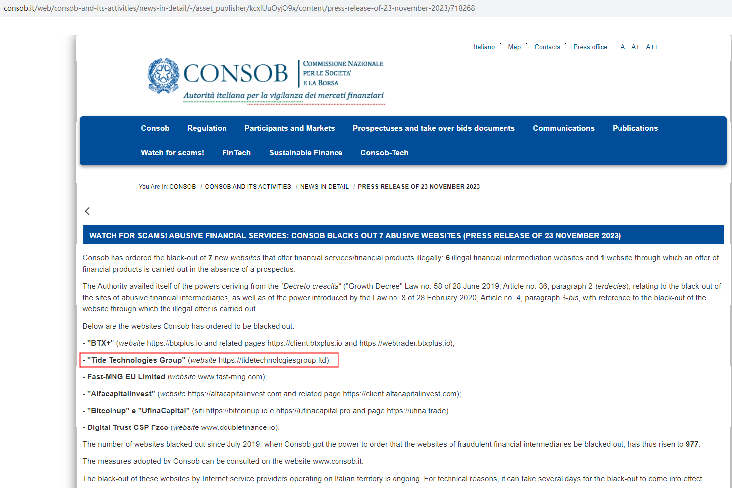 The Commissione Nazionale per le Società e la Borsa (CONSOB) issued a warning that Tide Technologies Group was providing financial services or products without authorisation.
