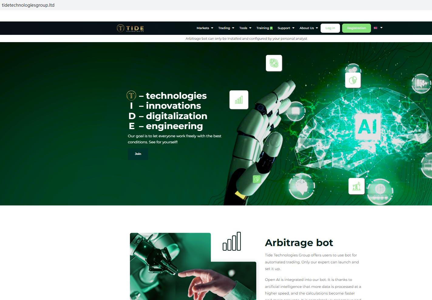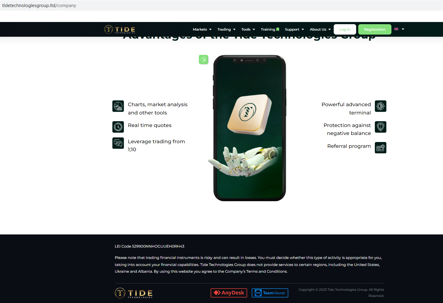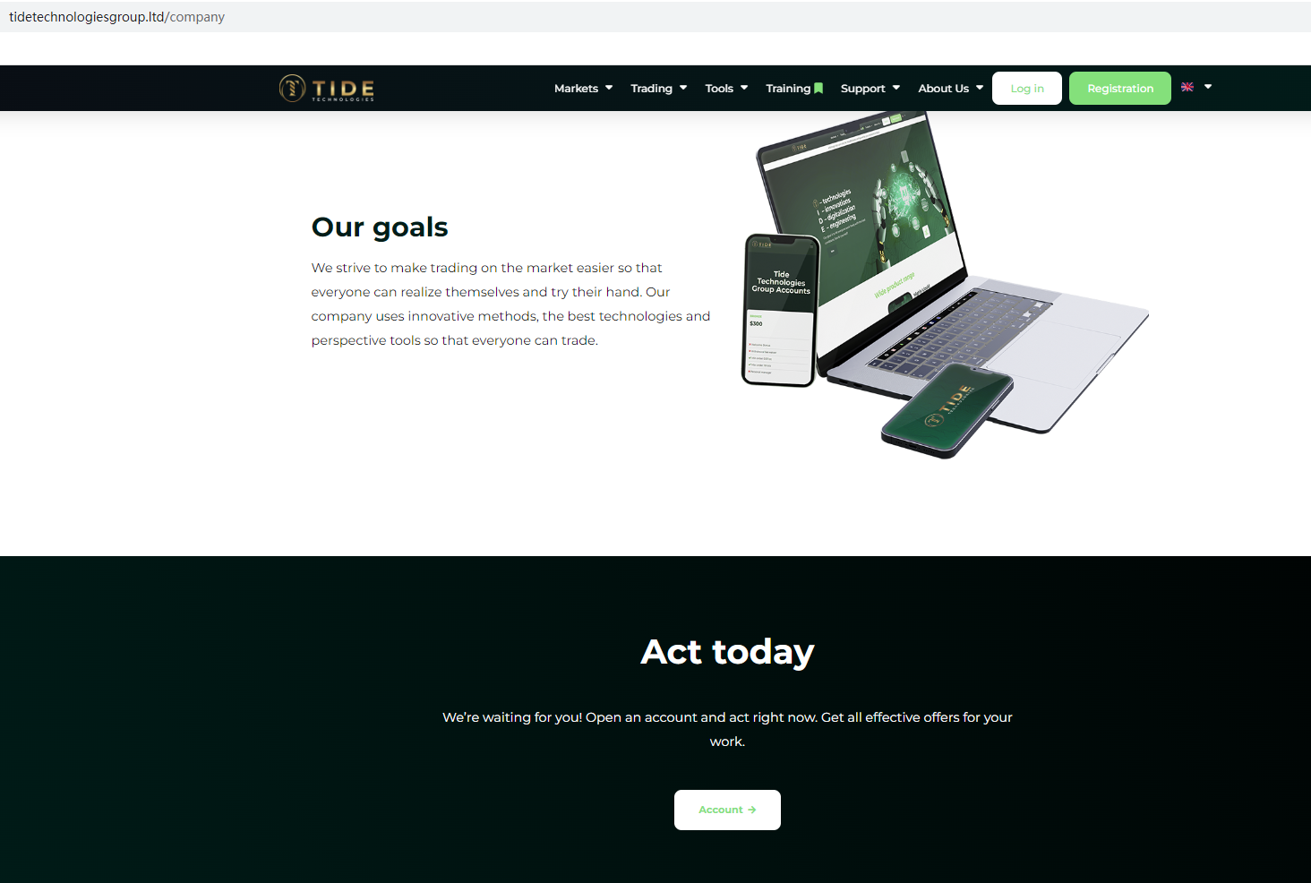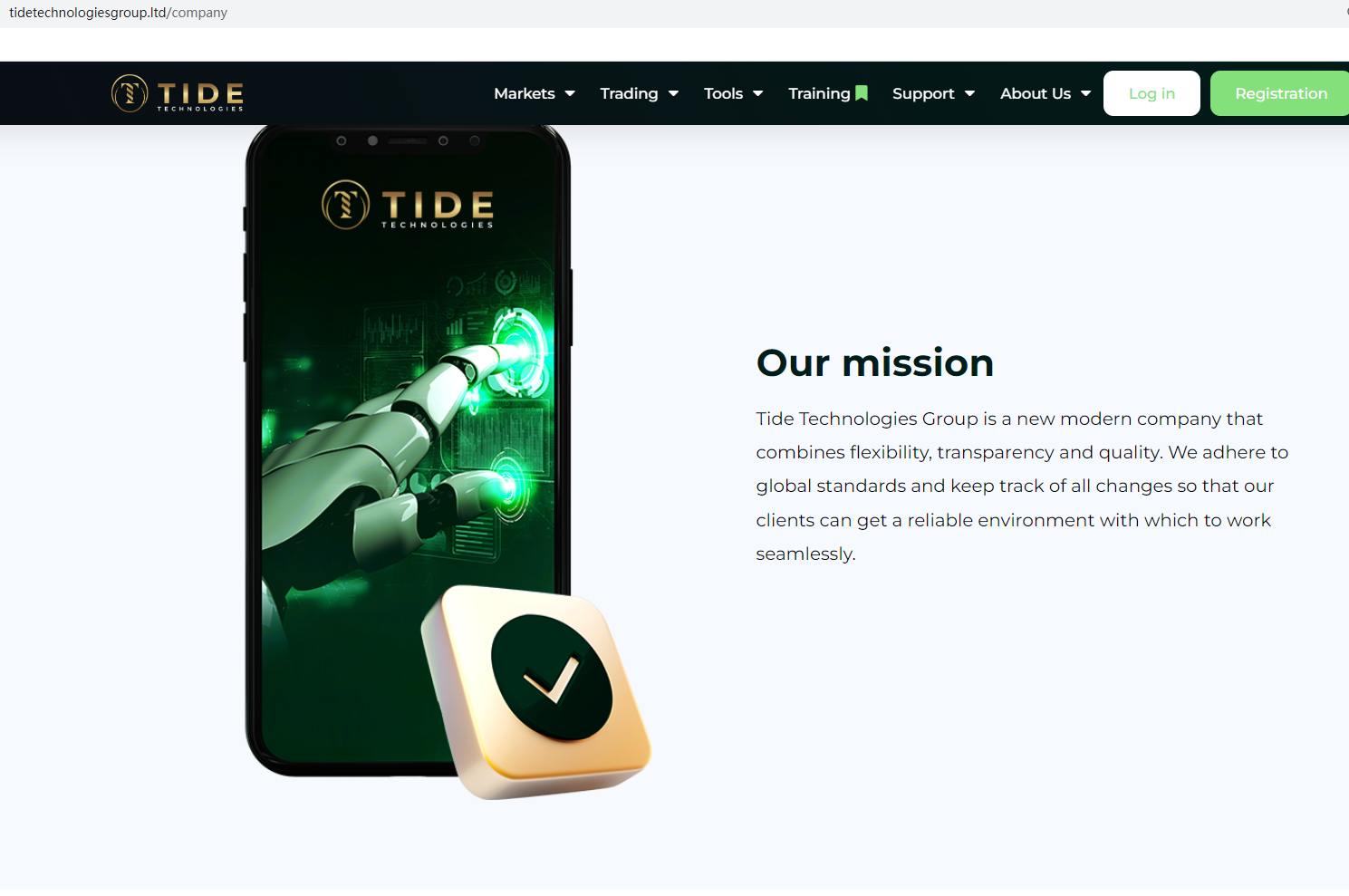 Tide Technologies Group claims to be a reliable company without presenting any information about its regulation or contact. The lack of such important information may be a distinct signal of an unlicensed broker, as regulated companies always present their accreditations and licenses in a prominent position. It is a red flag.