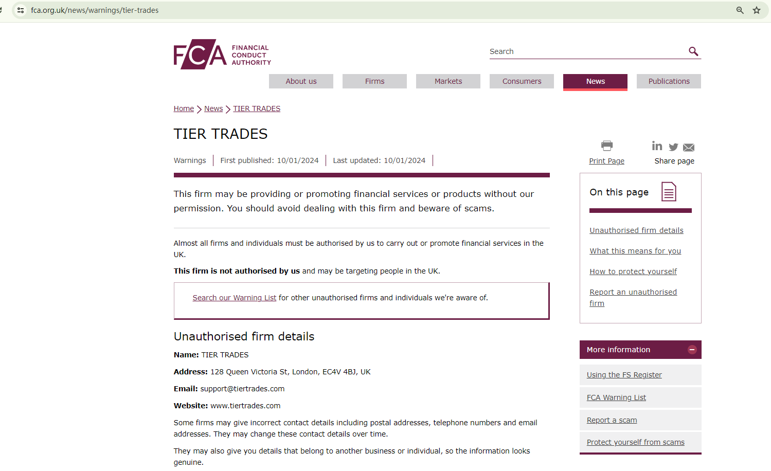 Furthermore, TIER TRADES asserts that it is based in the UK, where it would need to be authorized by the Financial Conduct Authority (FCA) to operate as a legitimate broker. Yet, it lacks such authorization, and the FCA has even flagged it as an unauthorized firm.