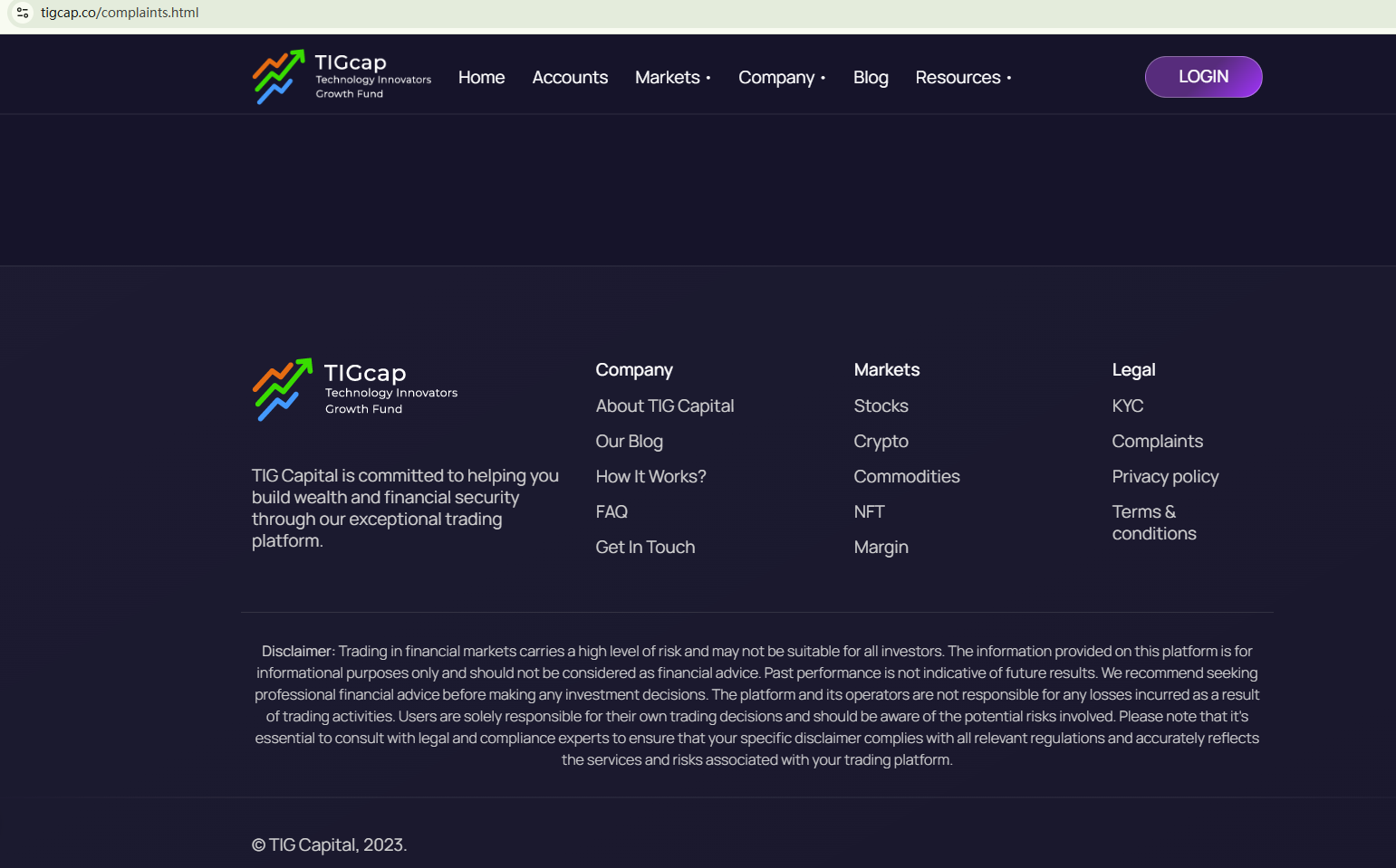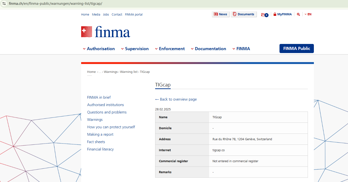 TIG Capital doesn't disclose useful information about its identity and regulatory status, which is a significant scam indicator. In addition, the Swiss Financial Market Supervisory Authority (FINMA) has issued a warning against TIG Capital, stating that this broker is not entered in its commercial register.
