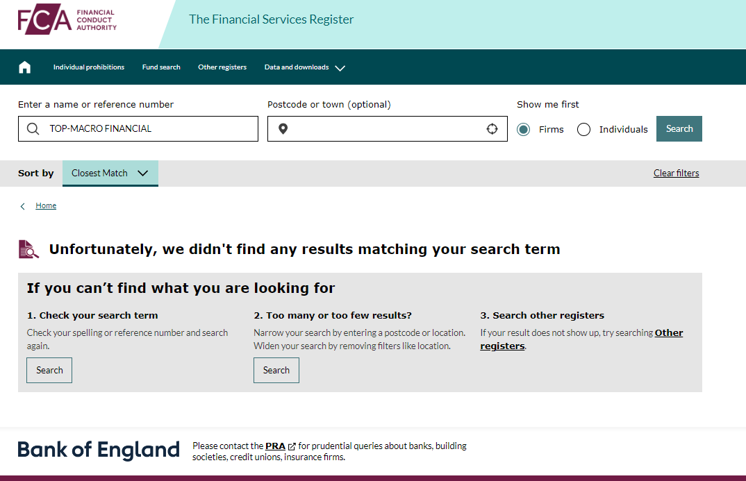 According to its website, TOP MACRO FINANCIAL is located in U.K.However there is no matching information was found in the Financial Conduct Authority (FCA).