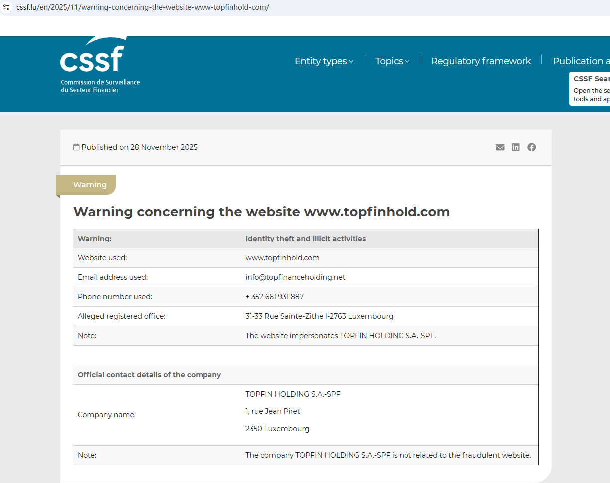 On November 28, 2025, the Commission de Surveillance du Secteur Financier (CSSF) issued a warning against Topfin, suspecting that this company may be providing financial services or products without proper authorization. https://www.cssf.lu/en/2025/11/warning-concerning-the-website-www-topfinhold-com/