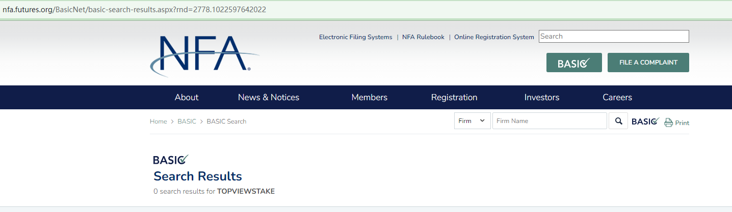 TopviewStake purports to have an office in the US. However, we checked the register of the National Futures Association (NFA) and didn't find any records suggesting that it is registered in accordance with the US regulations. As for the link named "regulation" on its homepage actually directs visitors to the page for registration.