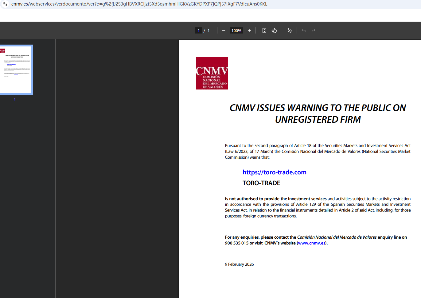 On Feb 9, 2026, the National Securities Market Commission (CNMV) issued a warning against Toro Trade, believing this company might be providing financial services or products without proper authorization. https://www.cnmv.es/webservices/verdocumento/ver?e=g%2fjJ2S3gHBVXRCljzt5Xd5qsmhmHlGKVzGKYDPXP7jQPj57IXgF7VdIcuAns0KKL
