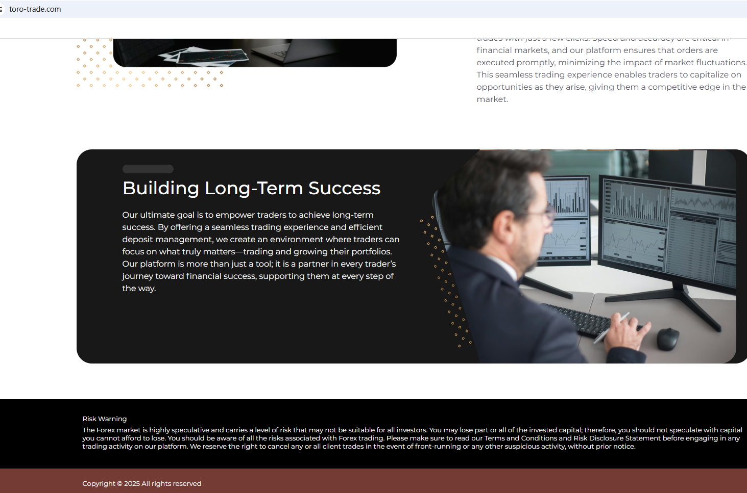 According to its website, it claims to be a reliable company, but it does not display any valid regulatory information on its website, and it does not even publish the most basic office address, which is a very untrustworthy practice. In addition, the National Securities Market Commission (CNMV) issued a warning against Toro Trade, believing this company might be providing financial services or products without proper authorization.