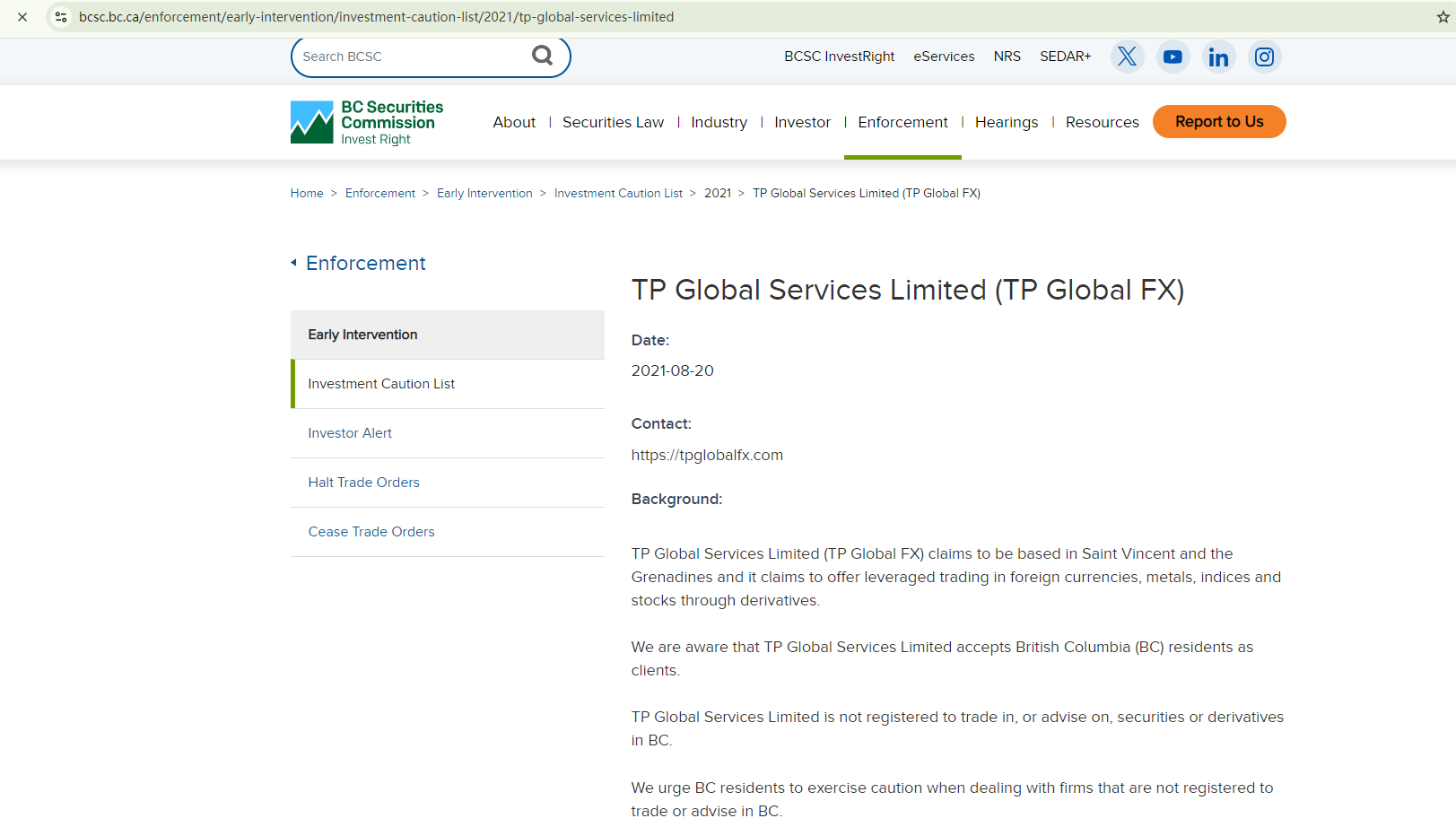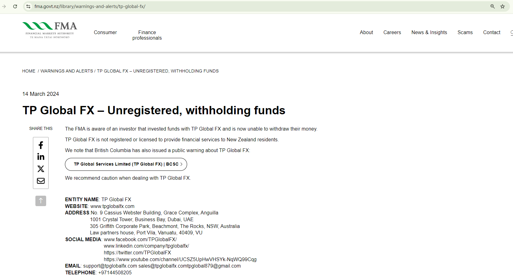 In addition, both the New Zealand Financial Markets Authority (FMA) and the British Columbia Securities Commission (BCSC) had issued warnings against TP Global FX.