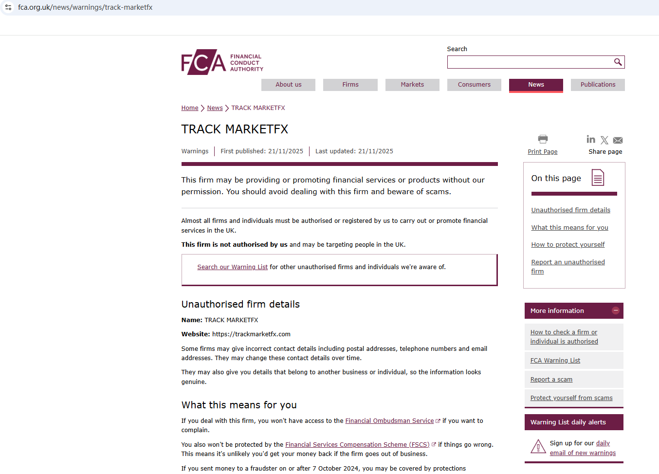 On November 21, 2025, the Financial Conduct Authority (FCA) issued a warning regarding TRACK MARKETFX, suspecting that this company may be offering financial services or products without the necessary authorization. https://www.fca.org.uk/news/warnings/track-marketfx