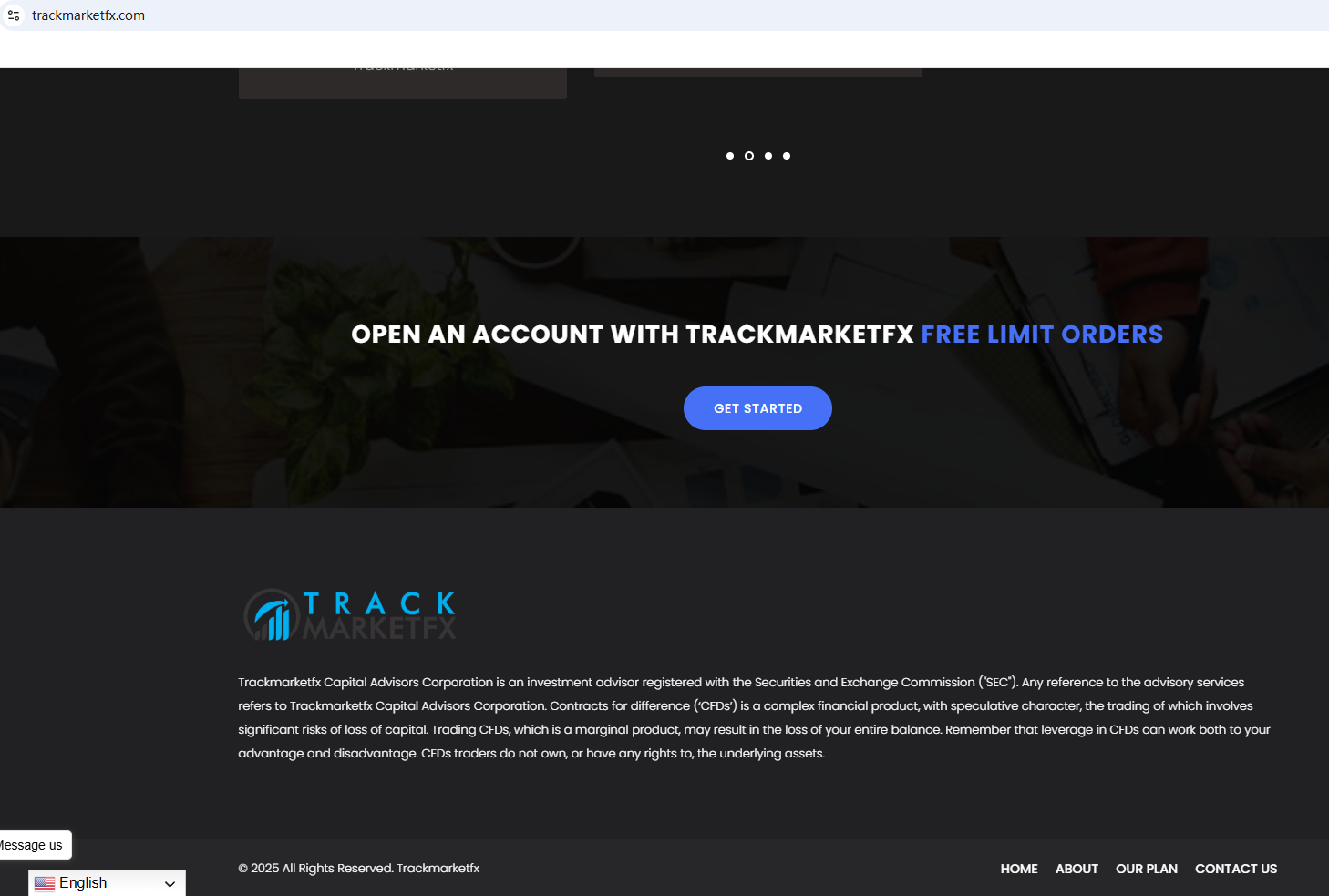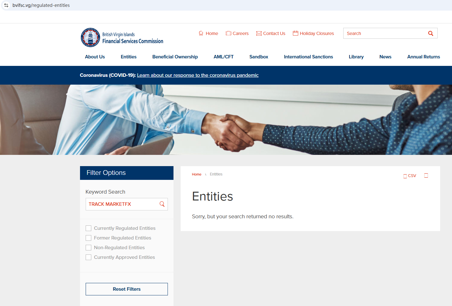 According to its website, it is regulated by the British Virgin Islands Financial Services Commission (BVI FSC), but a search of the BVI FSC found no matching information. It also mentions registration with the U.S. Securities and Exchange Commission (US SEC) at the bottom of its website; however, it is well known that the SEC does not have the authority to regulate foreign exchange. In addition, the Financial Conduct Authority (FCA) issued a warning regarding TRACK MARKETFX, suspecting that this company may be offering financial services or products without the necessary authorization.