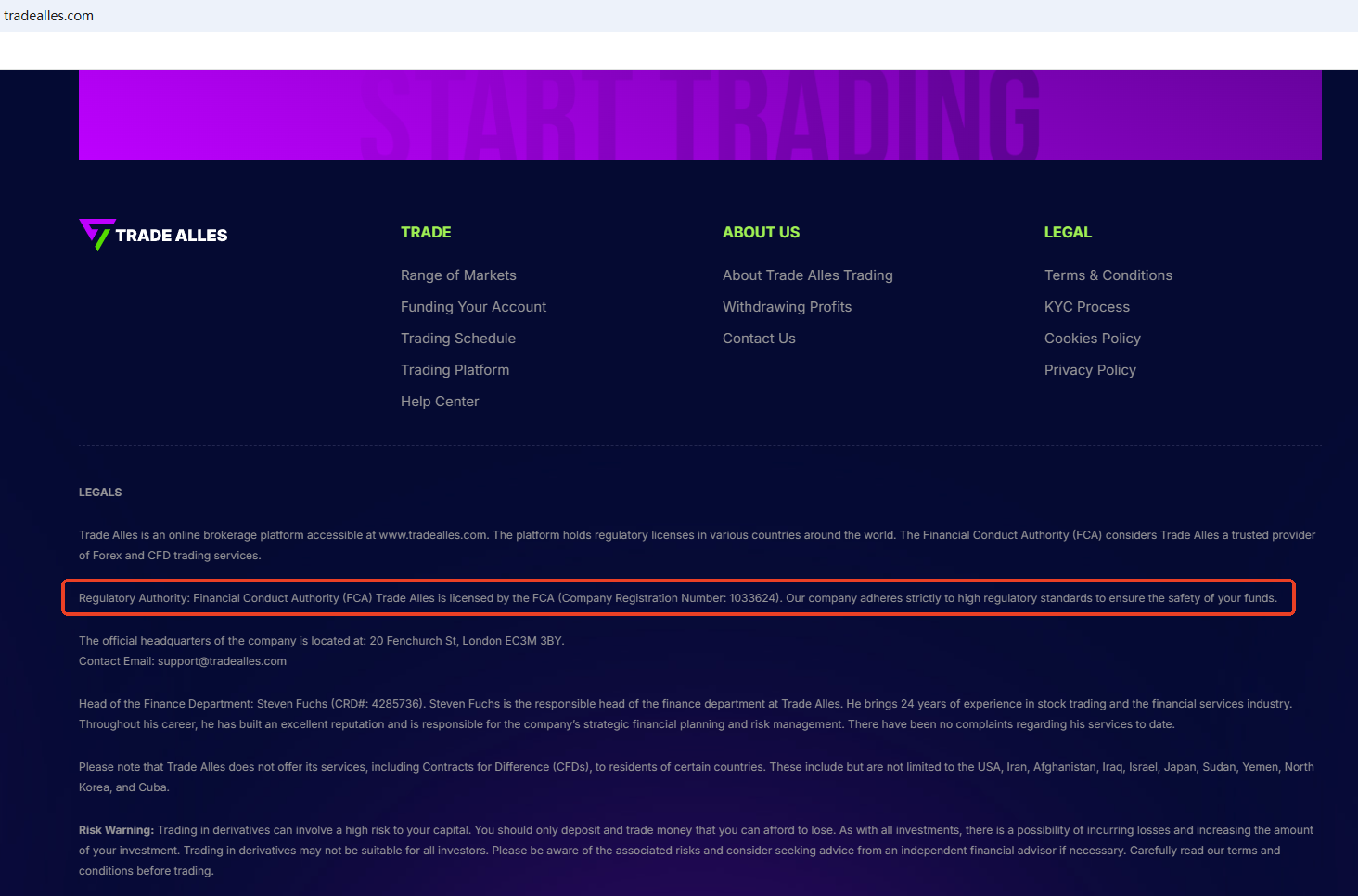 It claims to be a reliable company and regulated by the Financial Conduct Authority (FCA). Upon investigation, no matching information was found in the FCA. In addition, the Federal Financial Supervisory Authority (BaFin) issued a warning against Trade Alles, for lacking the required authorization.