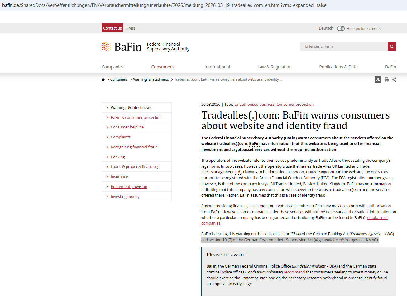On March 20, 2026, the Federal Financial Supervisory Authority (BaFin) issued a warning against Trade Alles, for lacking the required authorization. https://www.bafin.de/SharedDocs/Veroeffentlichungen/EN/Verbrauchermitteilung/unerlaubte/2026/meldung_2026_03_19_tradealles_com_en.html?cms_expanded=false