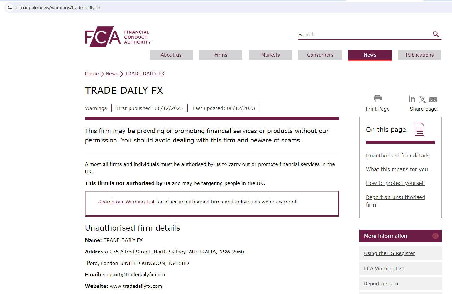 The United Kingdom Financial Conduct Authority (UK FCA) issued a warning that TRADE DAILY FX was providing finacial services or products without authorisation.