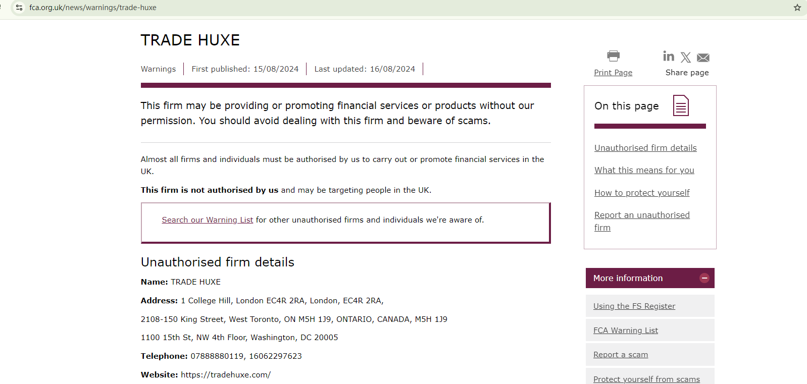 TRADE HUXE doesn't provide any regulatory information to substantiate its legitimacy. This lack of licensing details is a red flag for fraudulent activities.In addition, the Financial Conduct Authority (FCA) has issued a warning about TRADE HUXE, advising investors to stay away from this unauthorized firm as it may be part of potential dubious schemes.In essence, TRADE HUXE is not regulated by any governing body. Entrusting it with investors' funds is highly risky, as there are no legal protections in place to safeguard the funds.TRADE HUXE appears to be a scam.