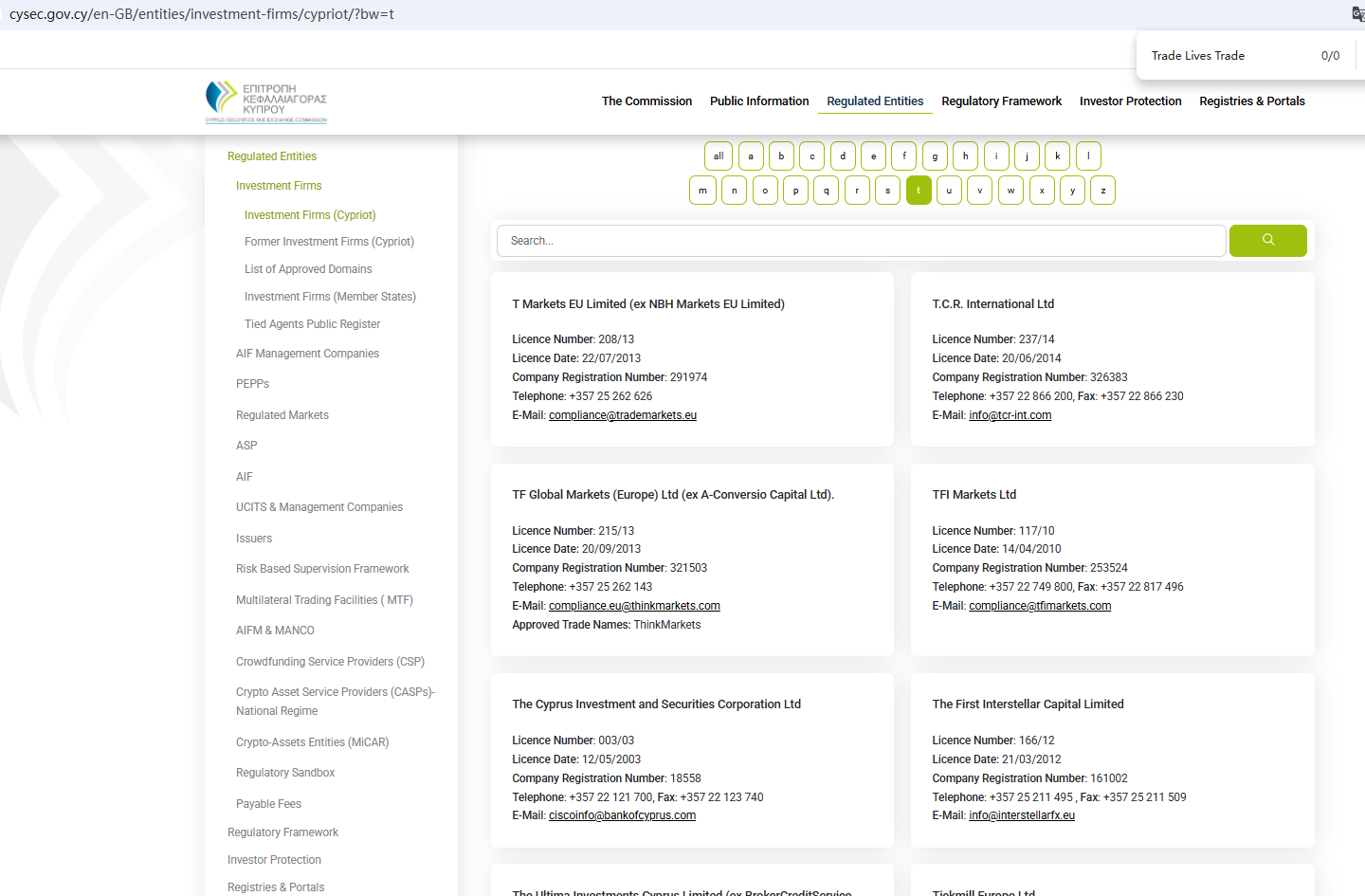 According to its website, it is regulated by both the Financial Conduct Authority (FCA) and the Cyprus Securities and Exchange Commission (CySEC). However, a search revealed no matching information with CySEC. Furthermore, the FCA issued a warning regarding Trade Lives Trade, suspecting that this company may be offering financial services or products without the necessary authorization.