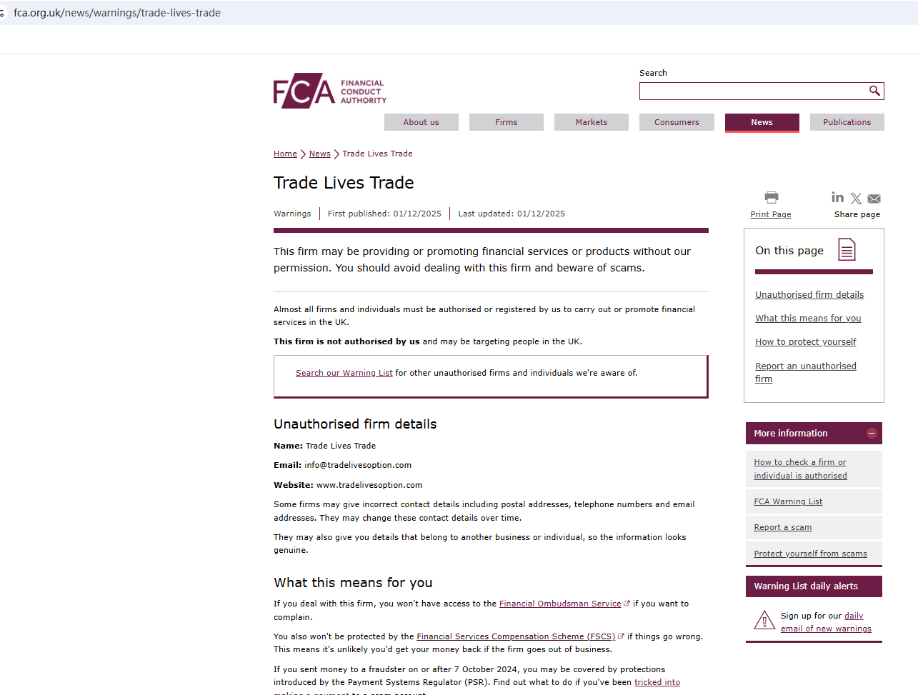 On Dec 1, 2025, the Financial Conduct Authority (FCA) issued a warning regarding Trade Lives Trade, suspecting that this company may be offering financial services or products without the necessary authorization. https://www.fca.org.uk/news/warnings/trade-lives-trade