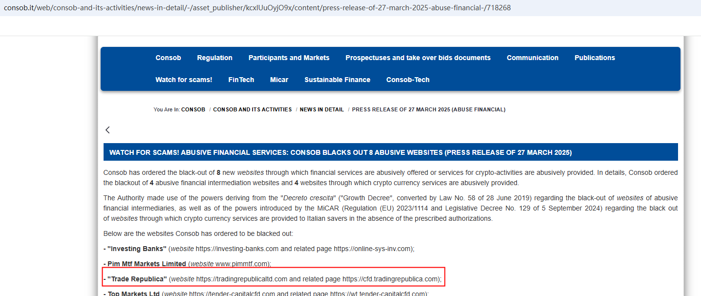 TRADE REPUBLICA, which registered its domain in late August 2024, claims to have a significant global presence. However, this assertion is questionable given its recent emergence. The broker also uses a certificate from FISEU to assert its legitimacy, but this regulator has been flagged as fake by the Federal Financial Supervisory Authority (BaFin) in Germany. Additionally, the Comisión Nacional del Mercado de Valores (CNMV) has added TRADE REPUBLICA to its warning list for providing unauthorized investment services.In essence, TRADE REPUBLICA is not regulated by any governing body. Entrusting it with investors' funds is highly risky, as there are no legal protections in place to safeguard the funds.TRADE REPUBLICA appears to be a scam.