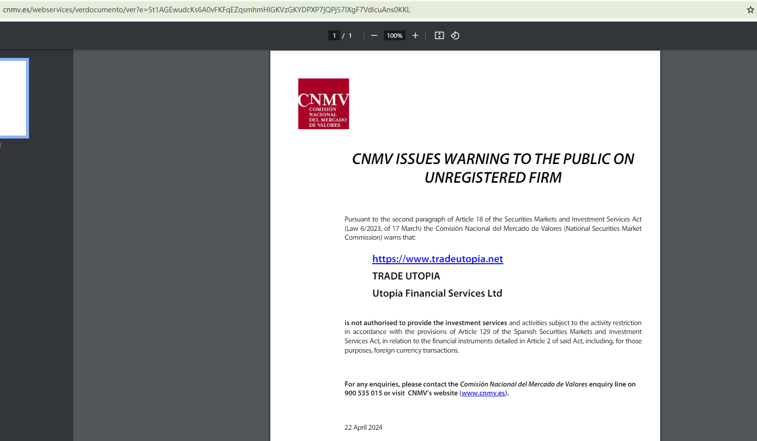 Additionally, the Comisión Nacional del Mercado de Valores (CNMV) has added TRADE UTOPIA to its warning list for providing investment services without authorization. This serves as compelling evidence of the broker's poor regulatory compliance.