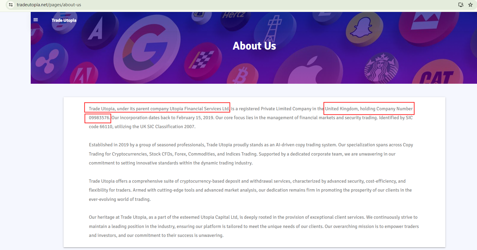 TRADE UTOPIA purports to be owned by Utopia Financial Services Ltd, a company allegedly registered under the number 09983576 in the UK and founded in 2019.