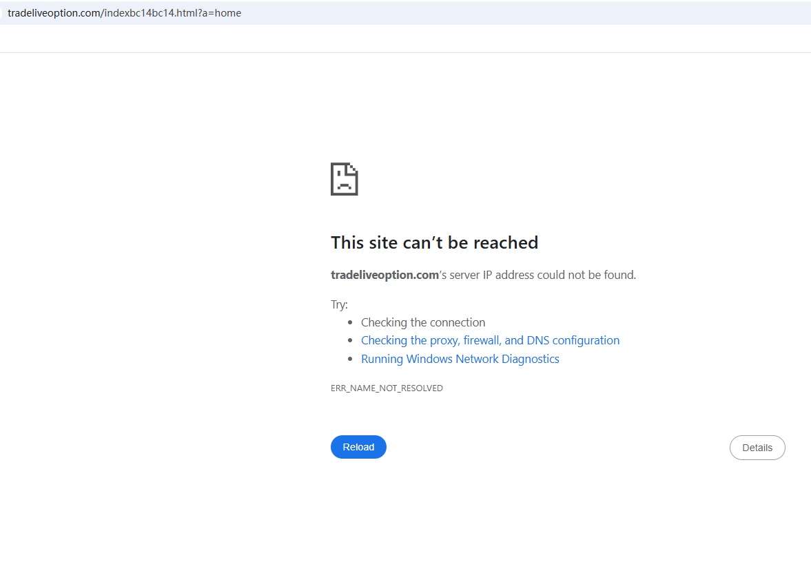 BrokersView found that the domain "https://tradeliveoption.com/indexbc14bc14.html?a=home" is currently inaccessible. This is widely regarded as a significant red flag, as the suspension of a broker's website often points to underlying regulatory or operational issues.