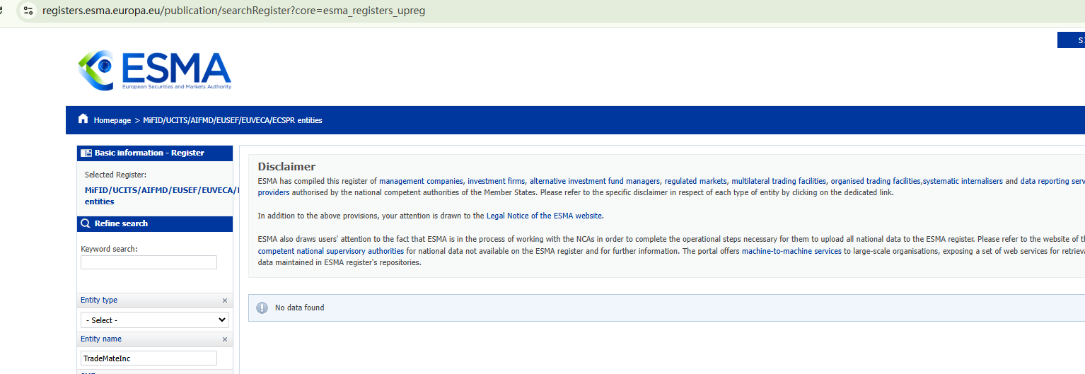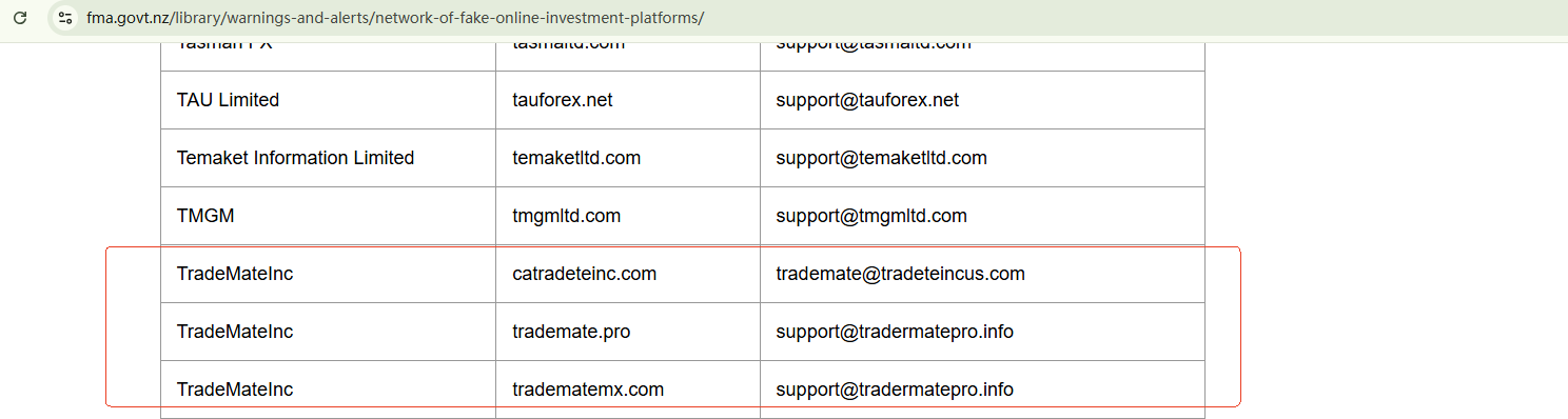 TradeMateInc runs three websites: tradematemx.com, trademate.pro, and catradeteinc.com. The broker claims to be regulated by various financial regulators. However, our verification suggests that all the regulation claims are fake. The New Zealand Financial Markets Authority (NZ FMA) has added TradeMateInc to its warning list as a fraudulent trading platform.