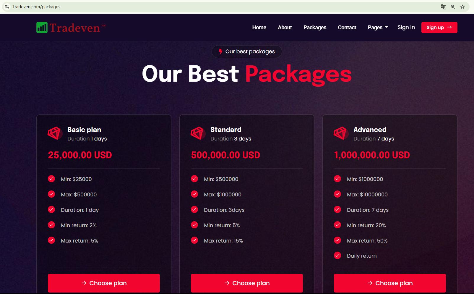 Furthermore, regarding the investment plans offered by Tradeven, the platform promises high returns within a specific timeframe. This is a classic hallmark of a Ponzi scheme. Therefore, Tradeven appears to be a scam.