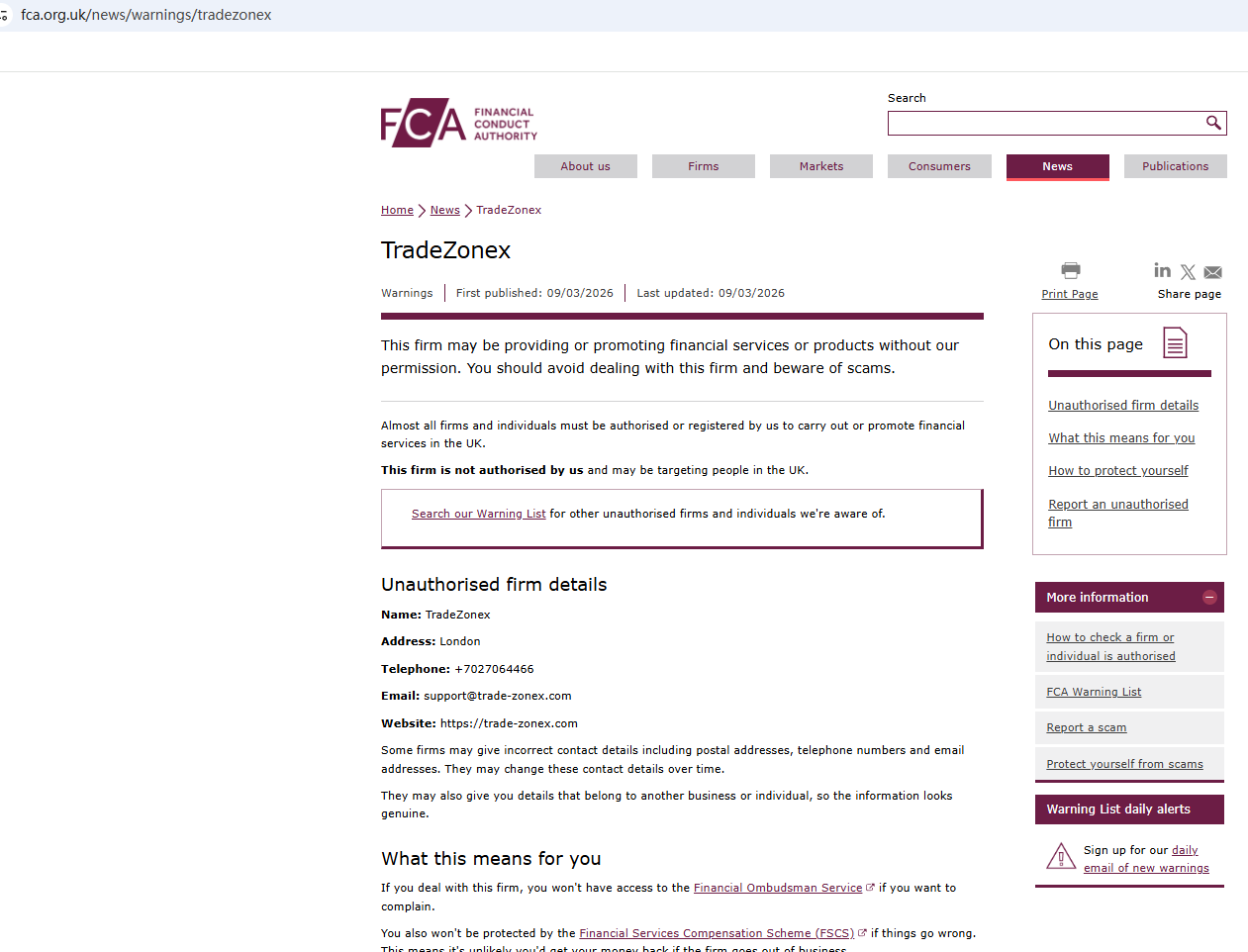 On Mar 9, 2026, the Financial Conduct Authority (FCA) issued a warning regarding TradeZonex, suspecting that this company may be offering financial services or products without the necessary authorization. https://www.fca.org.uk/news/warnings/tradezonex