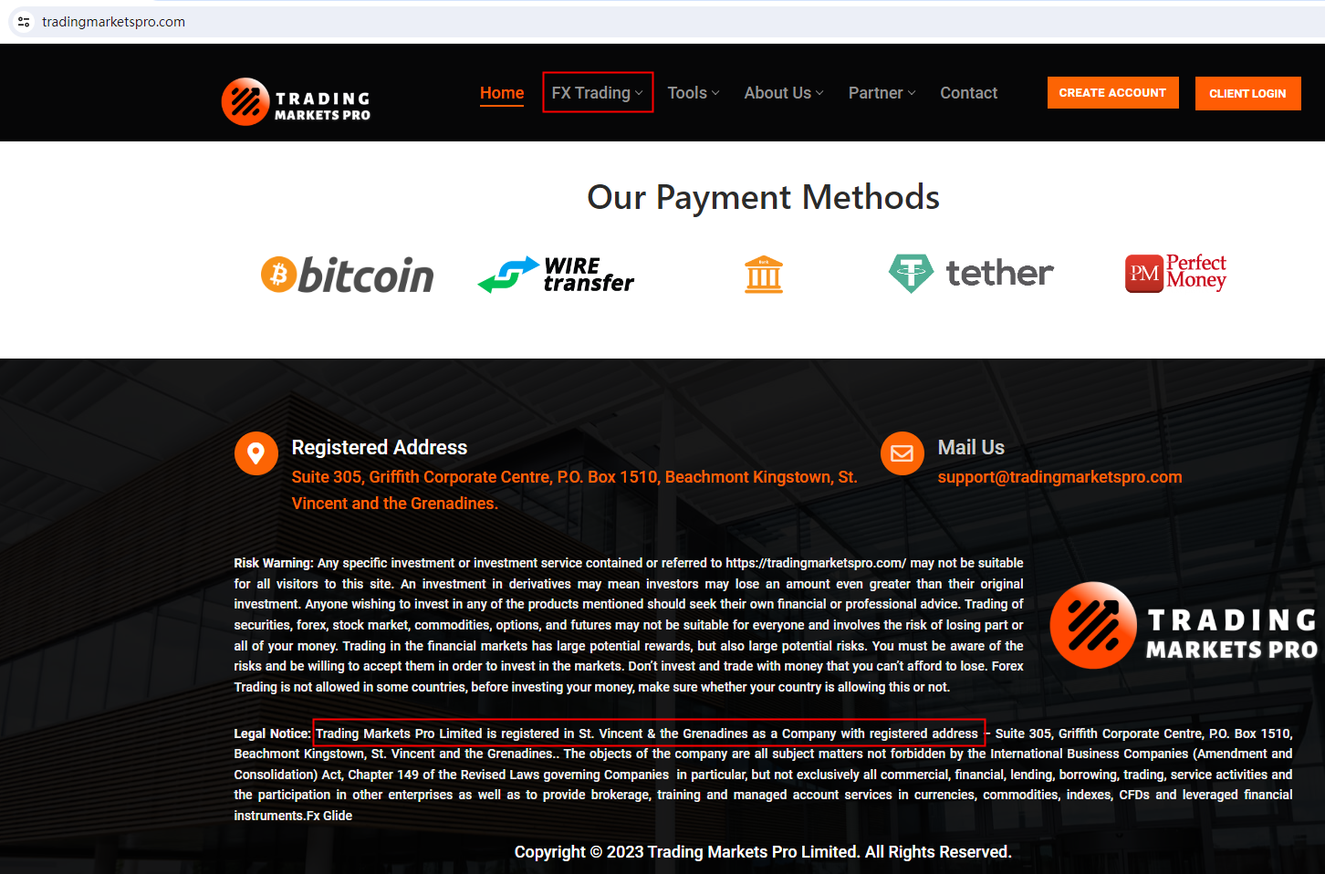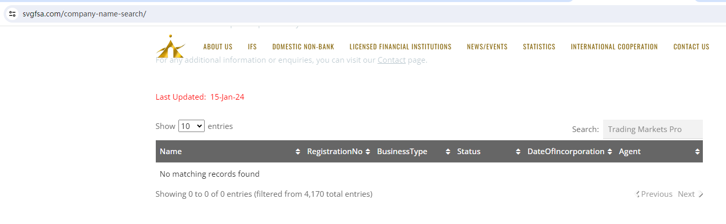 Trading Markets Pro claims to be registered in Financial Services Authority (FSA) of Saint Vincent and the Grenadines, but we don't find any results on FSA of Saint Vincent and the Grenadines matching to Trading Markets Pro.