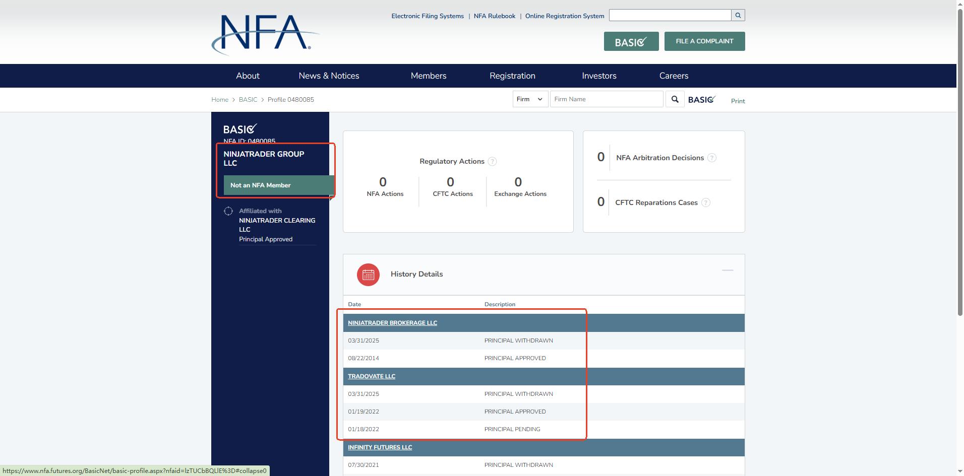 Tradovate claims to be operated by NinjaTrader Group LLC and references oversight by the National Futures Association (NFA) and the Commodity Futures Trading Commission (CFTC). However, our checks show that while NinjaTrader Group LLC appears in the NFA’s registration database, it is explicitly listed as not an NFA Member, meaning it does not hold an active NFA license to offer regulated trading services. Besides, there is also no record of authorization from the CFTC for retail forex or derivatives trading.