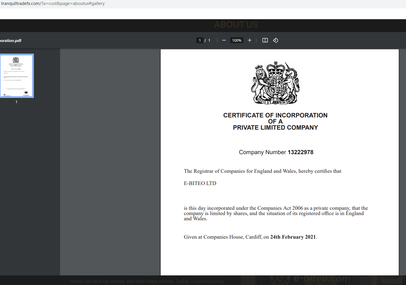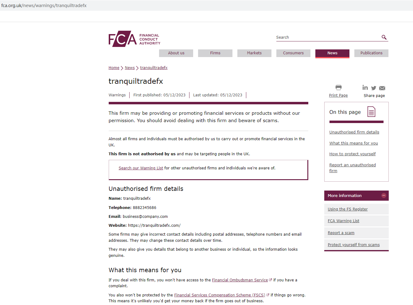 According to its website, it claims registered in Company House (CH), upon investigation, we found the matching information in the CH, but mere registration with the CH doesn't mean being authorized to provide financial services or products in the UK legally.In addition, the Financial Conduct Authority (FCA) issued a warning against tranquiltradefx, believing this broker might be providing financial services or products without proper authorization.The truth is that tranquiltradefx is not regulated by any regulators. Letting it hold or control investors' money is unsafe, and the money can not be protected by any laws.tranquiltradefx is a scam.