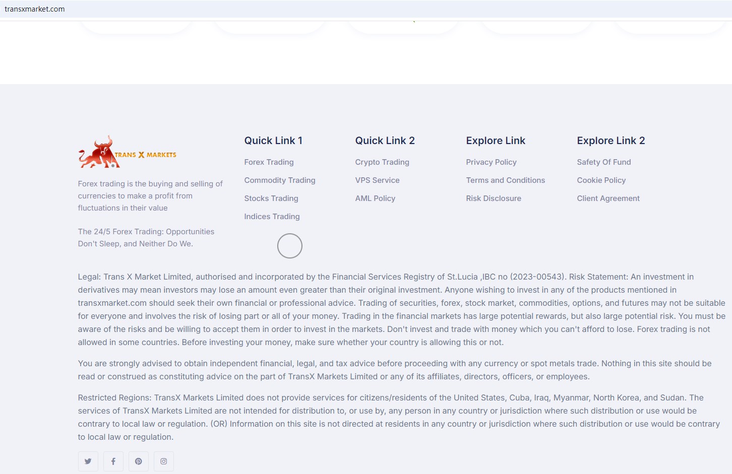 TransX Markets claims to be owned and operated by Trans X Market Limited, is a online broker authorised and incorporated by the Financial Services Registry of St.Lucia with registration number 2023-00543, which offers a range of investment products to traders, including Forex, Commodities, Stocks, Indices and more instruments for trading in global markets.Upon investigation, we found that Trans X Market Ltd is registered with the International Financial Centre (IFC) in Saint Lucia, an International Business Companies Registry that doesn't license forex trading brokerage activities. It is critical to note that this mere registration doesn't mean being licensed to carry on forex trading activities. The financial watchdog of St. Lucia, Financial Services Regulatory Authority (FSRA) has stated that forex trading activities are not licensed there. Without any other valid financial licenses, TransX Markets's financial services for forex trading are not legitimate.The truth is that TransX Markets is not regulated by any regulators. Letting it hold or control investors'money is unsafe, and the money can not be protected by any laws.TransX Markets is a scam.