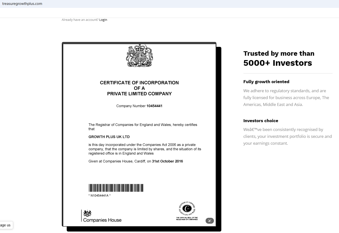 According to its website, it claims to be registered with Companies House (CH) and has its office address in the UK. It is well known that obtaining the right to exercise foreign exchange control in the UK requires approval from the Financial Conduct Authority (FCA); CH merely handles company registration and does not have the authority to regulate foreign exchange. Our investigation revealed that FCA issued a warning regarding TREASUREGROWTHPLUS, suspecting that this company may be offering financial services or products without the necessary authorization.