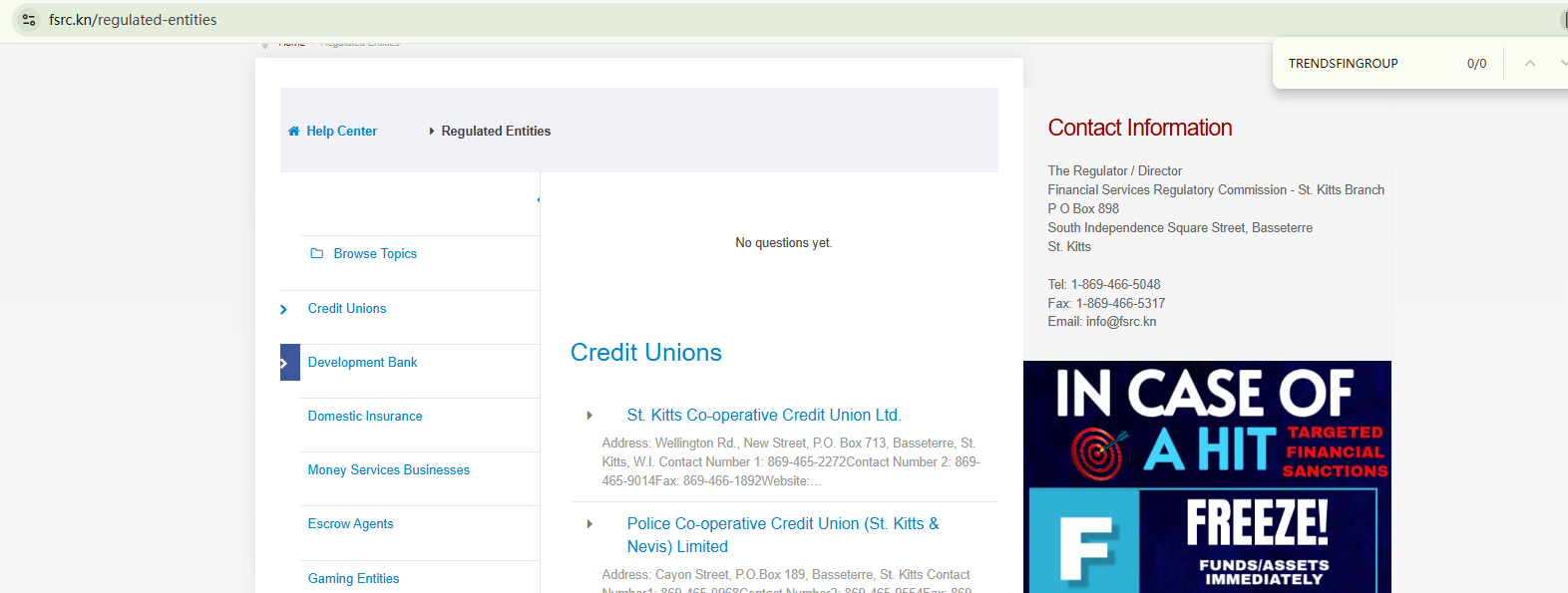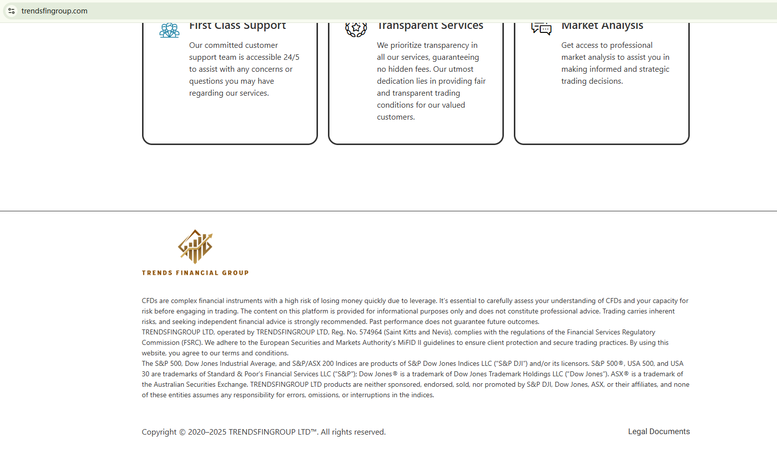 Trends Financial Group claims to be a CFDs broker registered with the Financial Services Regulatory Commission (FSRC) in Saint Kitts and Nevis. However, we haven't found any corresponding records in the Regulated Entities Register of the FSRC.