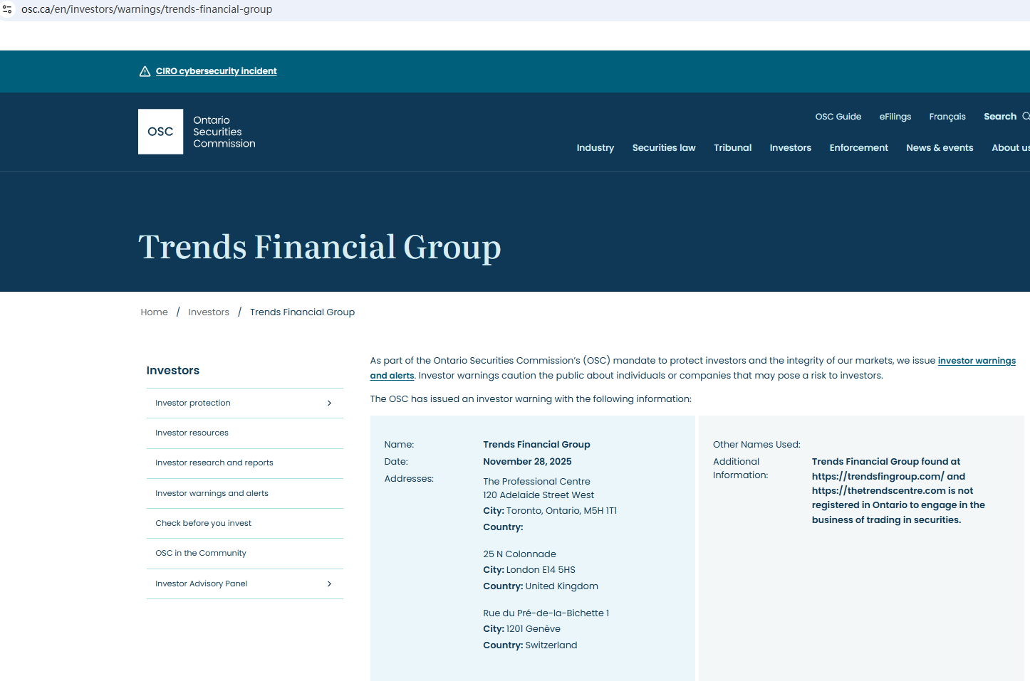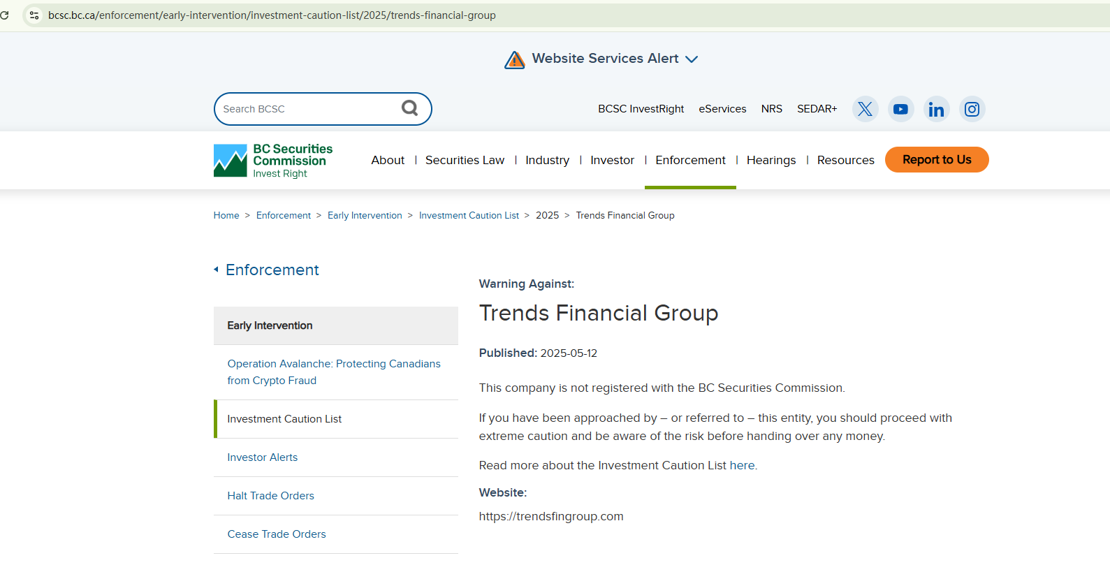 In addition, the British Columbia Securities Commission (BCSC) issued a warning against Trends Financial Group, stating that this broker is not registered to trade in, or advise on, securities or derivatives in BC.