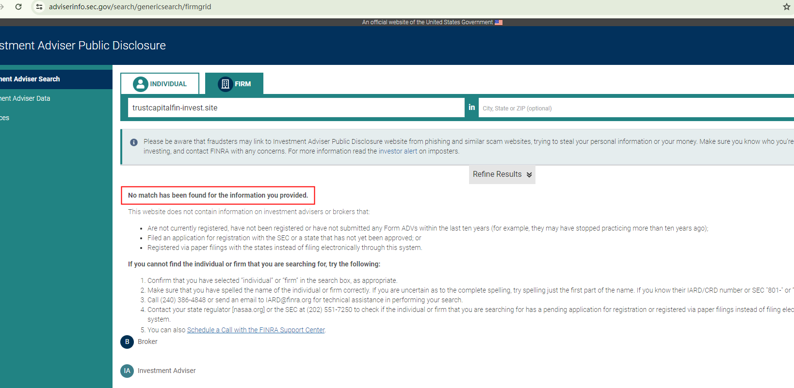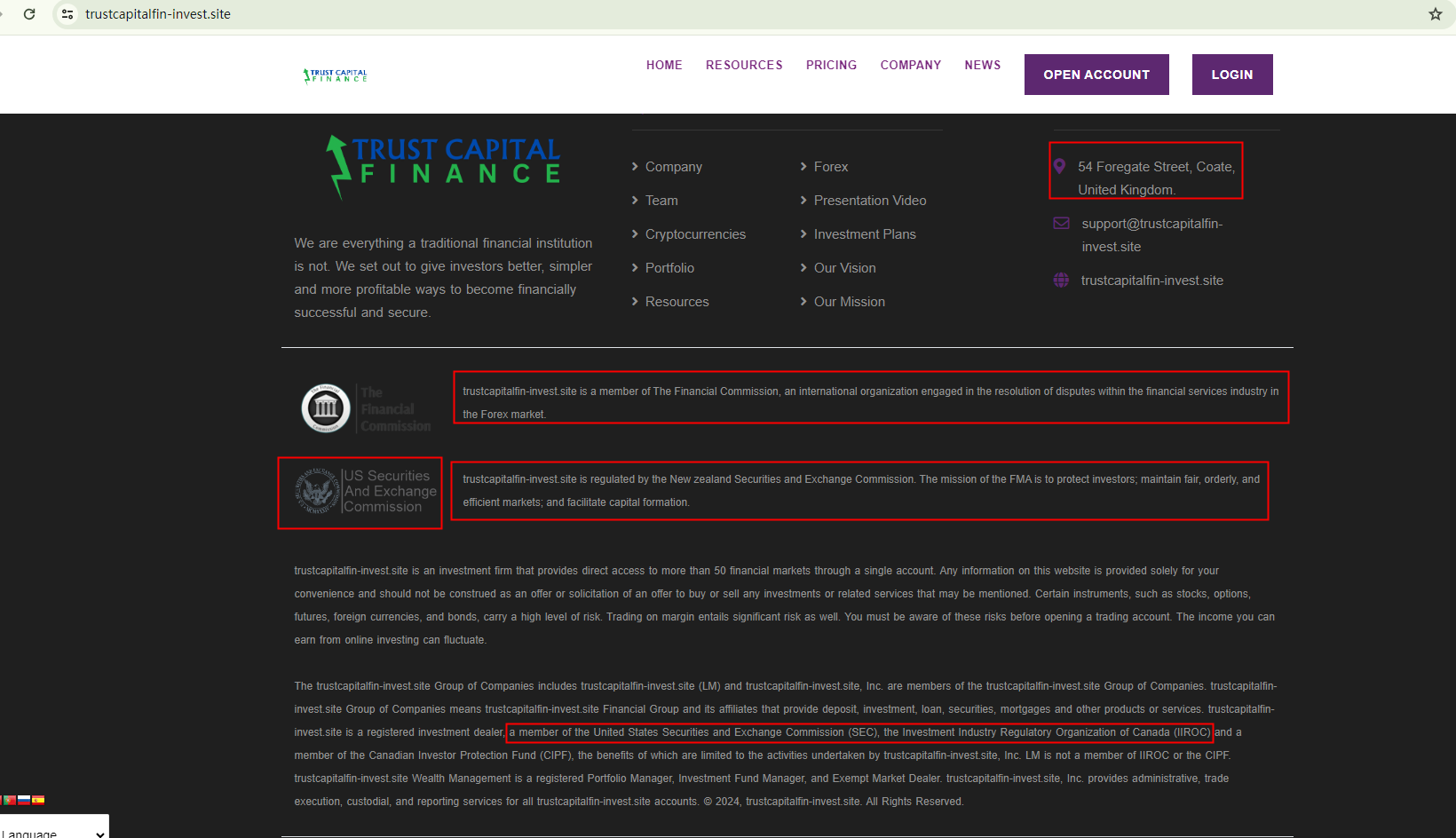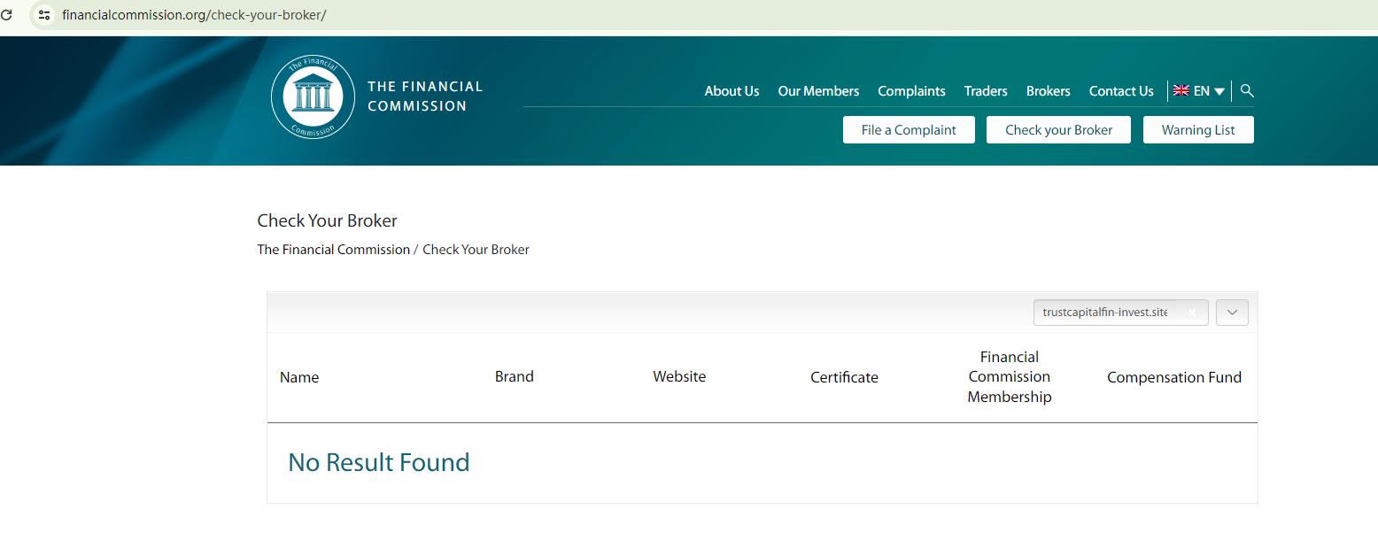The regulatory information TRUST CAPITAL FINANCE claims is confusing. We organized it and concluded that it purports to be regulated by the U.S. Securities and Exchange Commission (SEC), the Investment Industry Regulatory Organization of Canada (IIROC), and be a member of the Financial Commission.However, our investigation suggests its assertions are all baseless, as there are no corresponding records from the aforementioned authorities or organizations to back them up.In addition, the UK's financial regulator, the Financial Conduct Authority (FCA) has issued a warning against TRUST CAPITAL FINANCE, identifying it as an unauthorized firm.In essence, TRUST CAPITAL FINANCE is not regulated by any governing body. Entrusting it with investors' funds is highly risky, as there are no legal protections in place to safeguard the funds.TRUST CAPITAL FINANCE appears to be a scam.