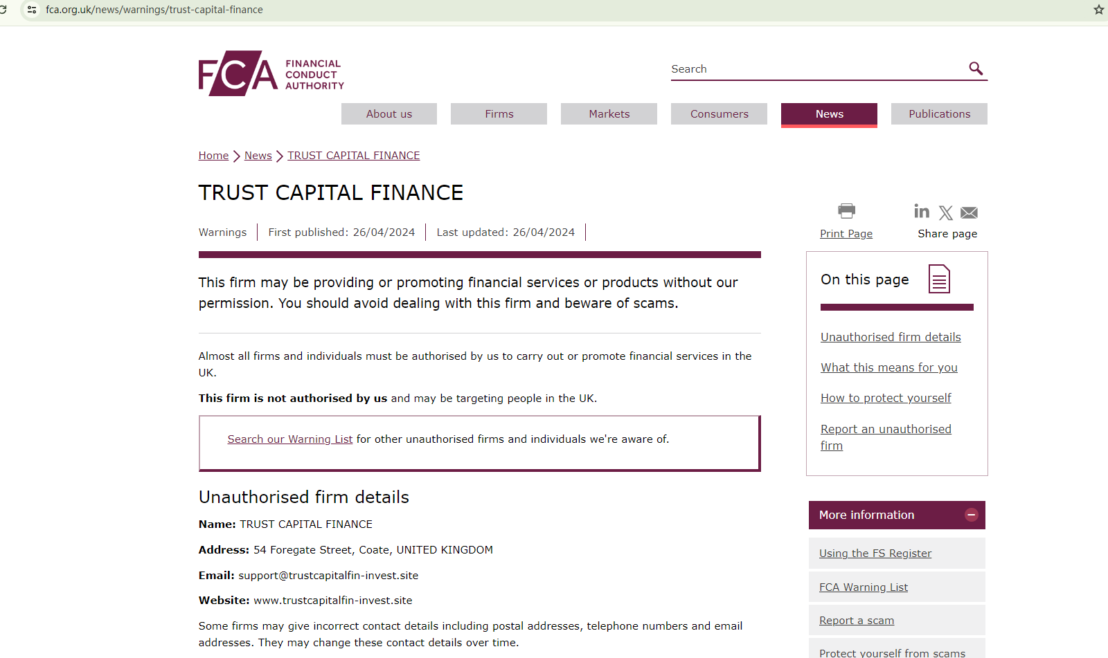 In addition, the UK's financial regulator, the Financial Conduct Authority (FCA) has issued a warning against TRUST CAPITAL FINANCE, identifying it as an unauthorized firm.