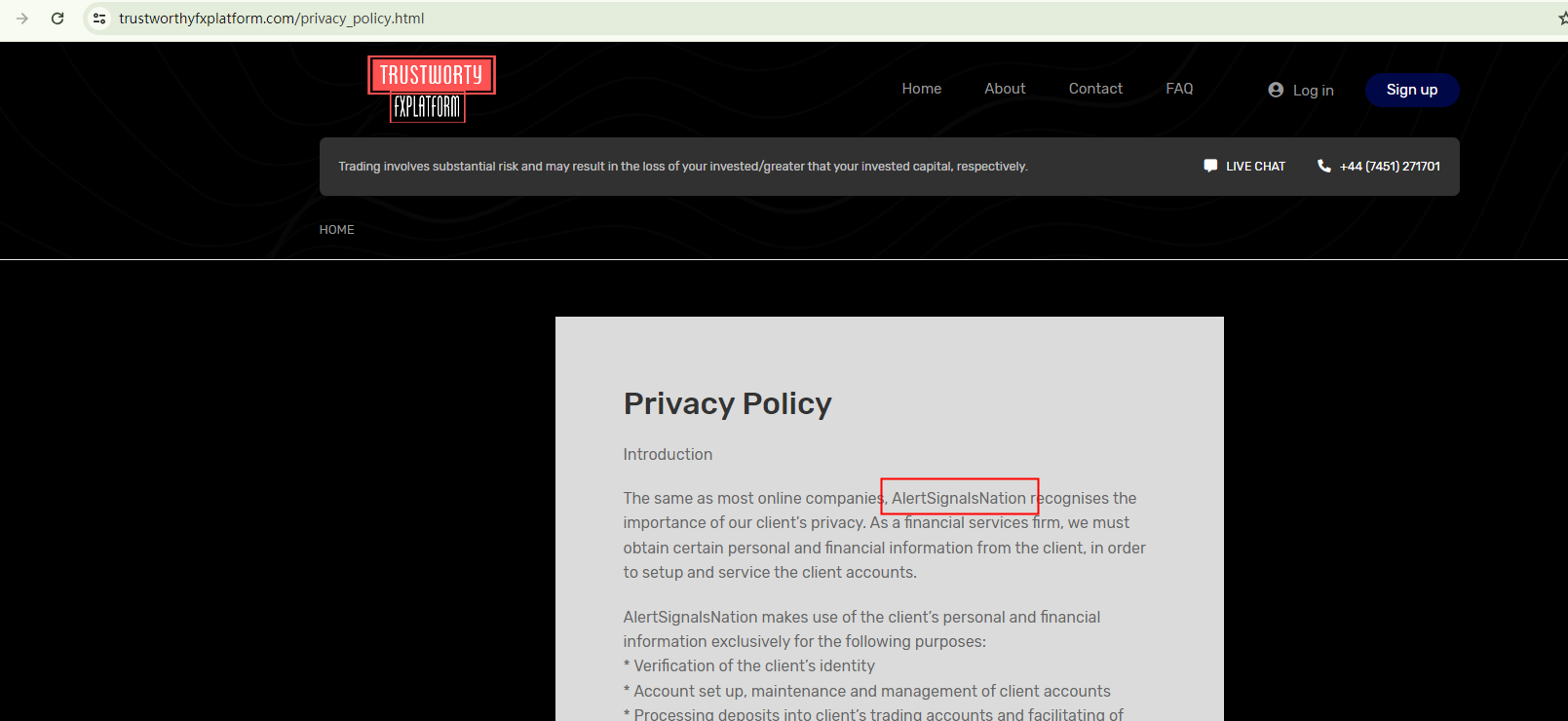 Despite its name, TRUSTWORTHY FXPLATFORM is far from trustworthy. This broker uses a website template, commonly associated with scammers, that provides content and graphic designs, making it effortless for operators to build a website. It has even failed to replace all brand names with its own, leading to instances where it refers to itself as TheAlertNation sometimes.The broker lists two office addresses, one in the UK and another in the US. However, the UK address appears to be shared by several fraudulent trading platforms, and the US address seems to be a convention center. Its claim of five years of experience is contradicted by the fact that its domain name was only registered in June 2023.Moreover, the Financial Conduct Authority (FCA) has issued a warning stating that TRUSTWORTHY FXPLATFORM is an unauthorized firm in the UK. In essence, this broker is not regulated by any governing body, making it highly risky for investors due to the lack of legal protections for their funds.In conclusion, TRUSTWORTHY FXPLATFORM appears to be a scam.