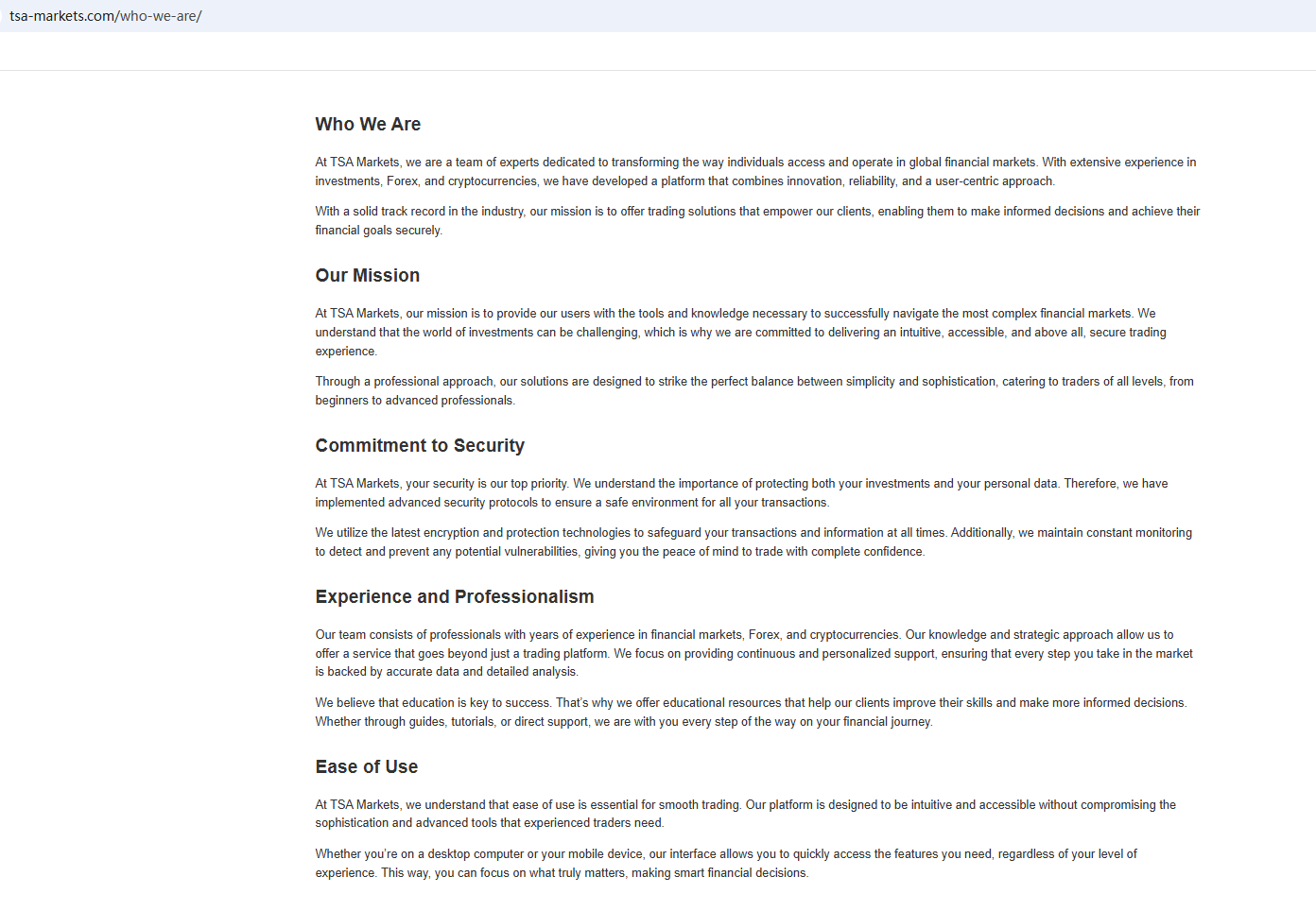 In essence, Tsa Markets is not regulated by any governing body. Entrusting it with investors' funds is highly risky, as there are no legal protections in place to safeguard the funds. Tsa Markets appears to be a scam.