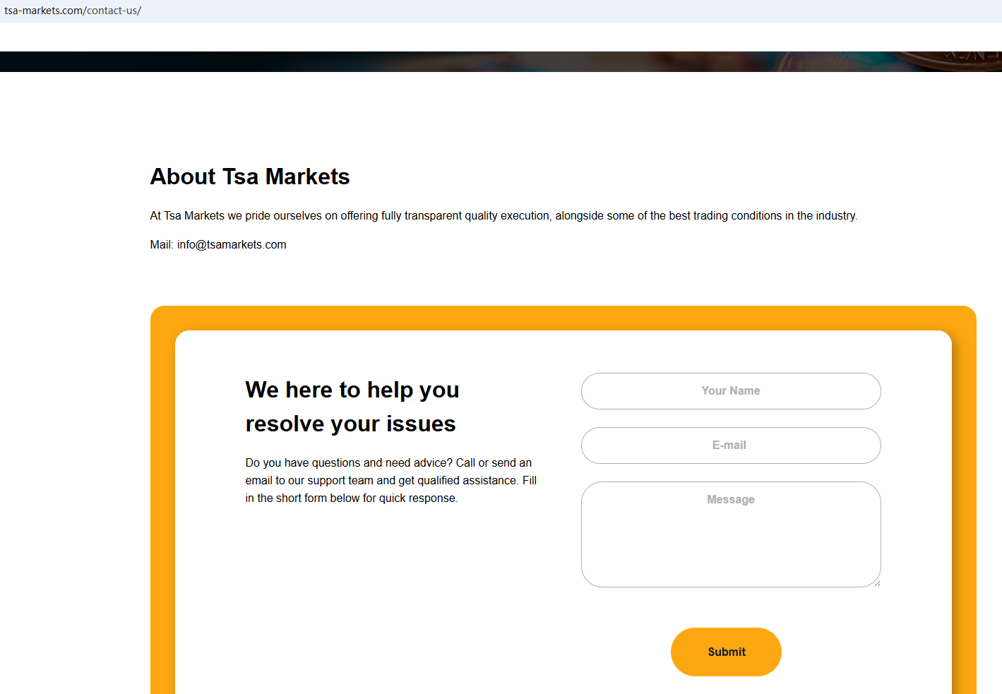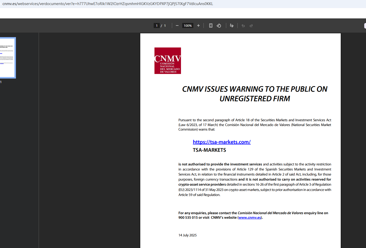 In aadition, the National Securities Market Commission (CNMV) issued a warning against Tsa Markets, believing this company might be providing financial services or products without proper authorization.