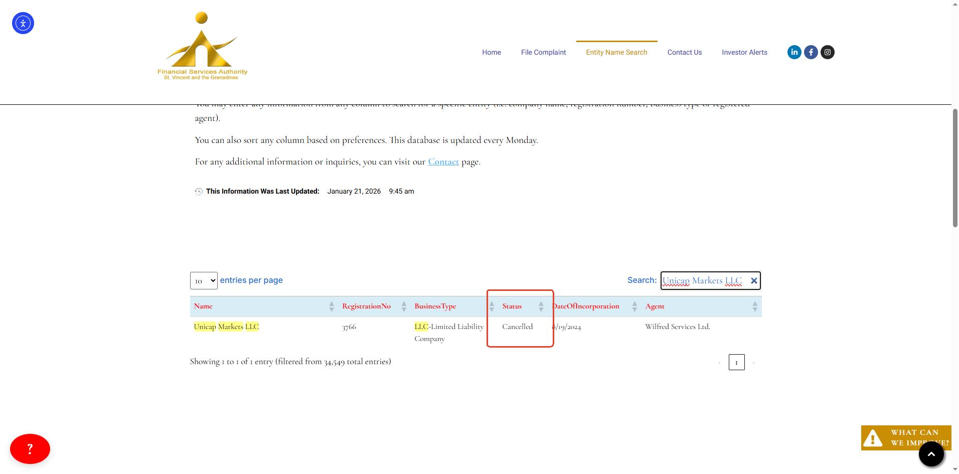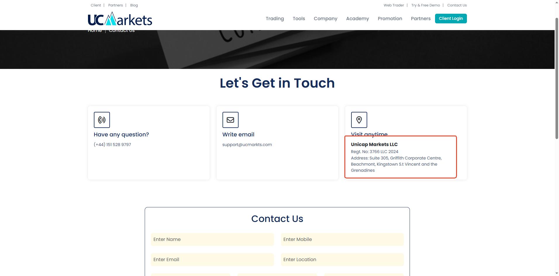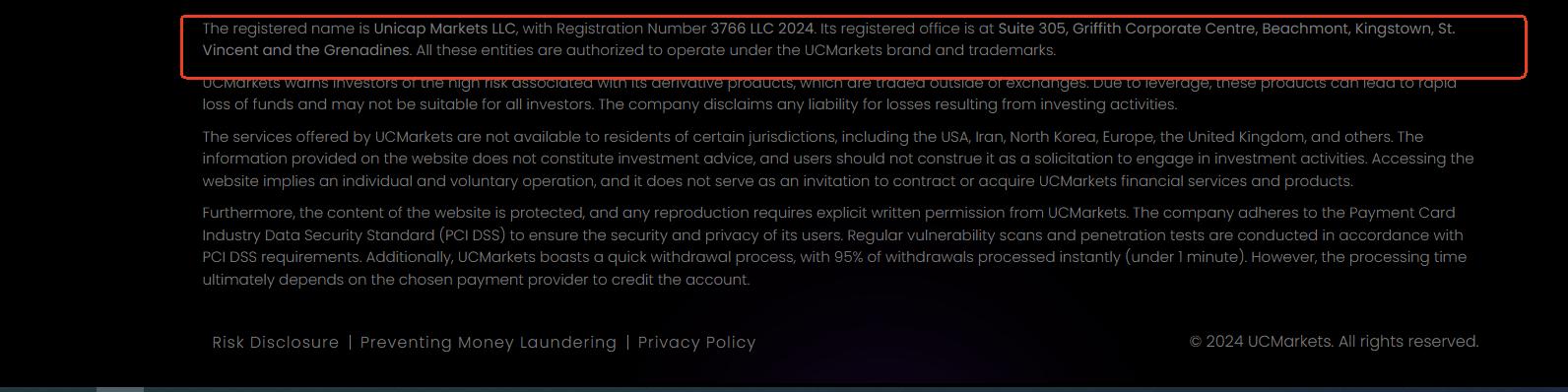 UCMarkets only claims to be registered in Saint Vincent and the Grenadines on its website. While we can find a matching company in the Financial Services Authority (FSA) registry of Saint Vincent and the Grenadines, this only grants International Business Company (IBC) status. This does not constitute a valid financial licence. The SVG FSA has clearly stated that it does not regulate or licence forex brokers.  Furthermore, its registration status in Saint Vincent is now shown as "cancelled," indicating that the entity may have underlying operational issues.