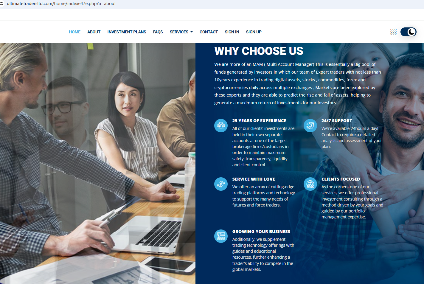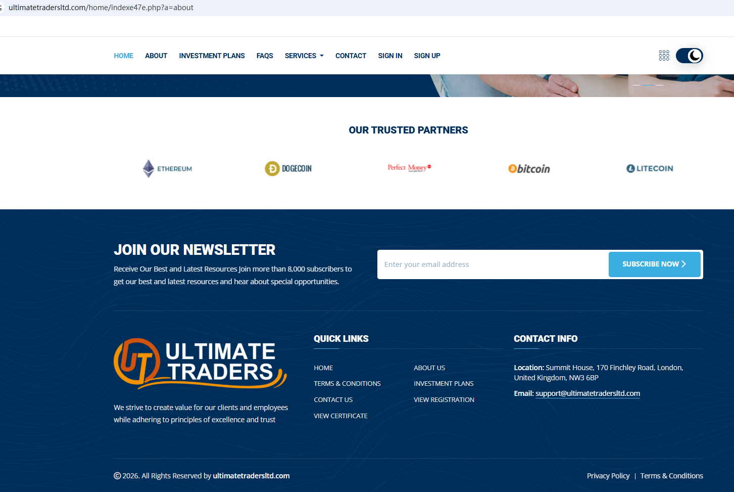 According to its website, it is located in the UK. Upon investigation, we found that the Financial Conduct Authority (FCA) issued a warning regarding Ultimate Traders (ultimatetradersltd.com), suspecting that this company may be offering financial services or products without the necessary authorization.