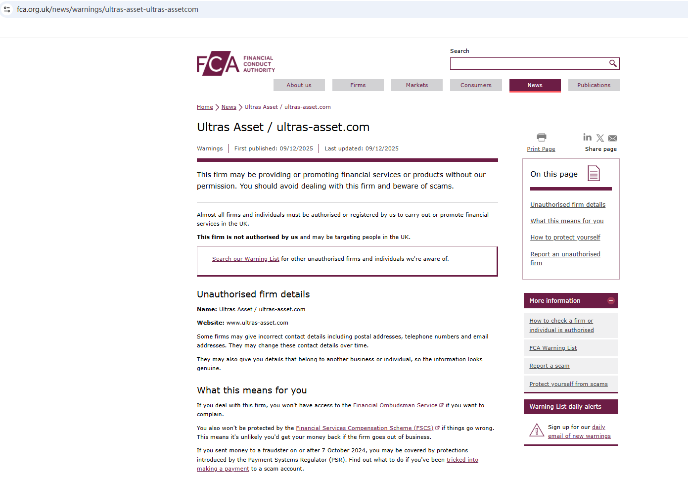 On Dec 9, 2025, the Financial Conduct Authority (FCA) issued a warning regarding Ultras Asset, suspecting that this company may be offering financial services or products without the necessary authorization. https://www.fca.org.uk/news/warnings/ultras-asset-ultras-assetcom