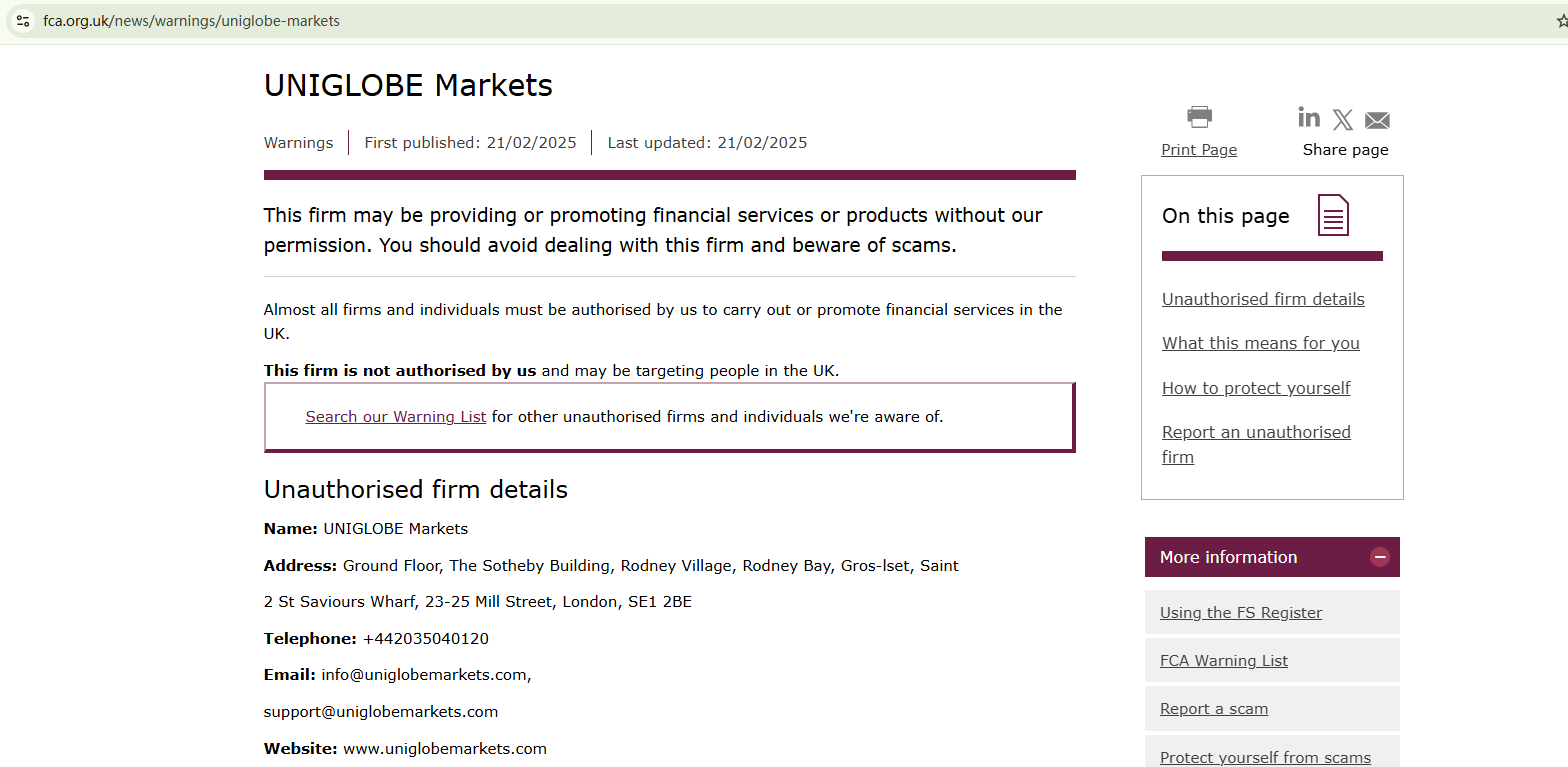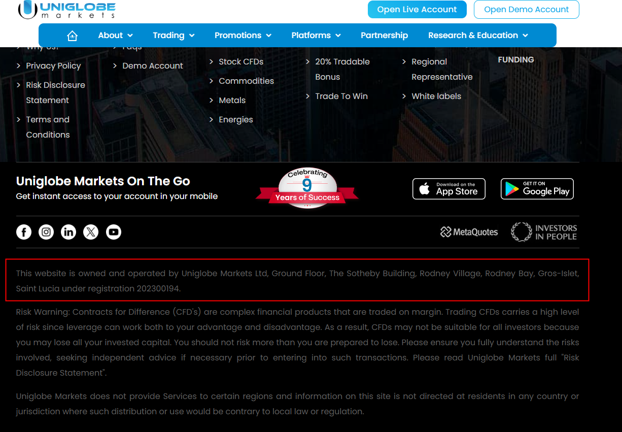 According to its website, it claims to be registered in Saint Lucia with registration number 202300194, but there is no matching information was found in the Financial Services Regulatory Authority (FSRA).In addition, the Cyprus Securities and Exchange Commission (CySEC) issued a warning that Uniglobe Markets was providing financial services or products without authorisation. The truth is that Uniglobe Markets is not regulated by any regulators. Letting it hold or control investors' money is unsafe and the money can not be protected by any laws.Therefore, Uniglobe Markets is a scam.
