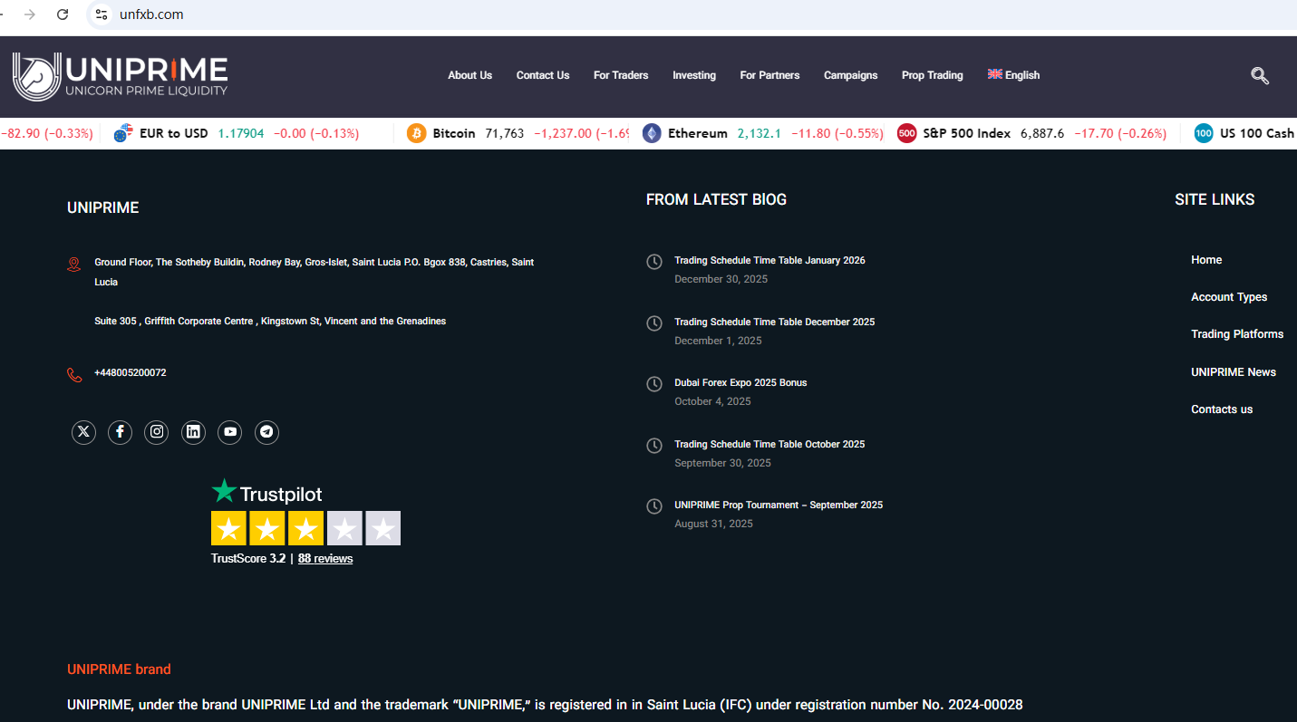 UNIPRIME claims to be an international broker registered in in Saint Lucia (IFC) under registration number No. 2024-00028 and located in Saint Vincent and the Grenadines, offering a range of investment products to traders, including stock, index, Cryptocurrency, forex, metal, and more instruments for trading in global markets.